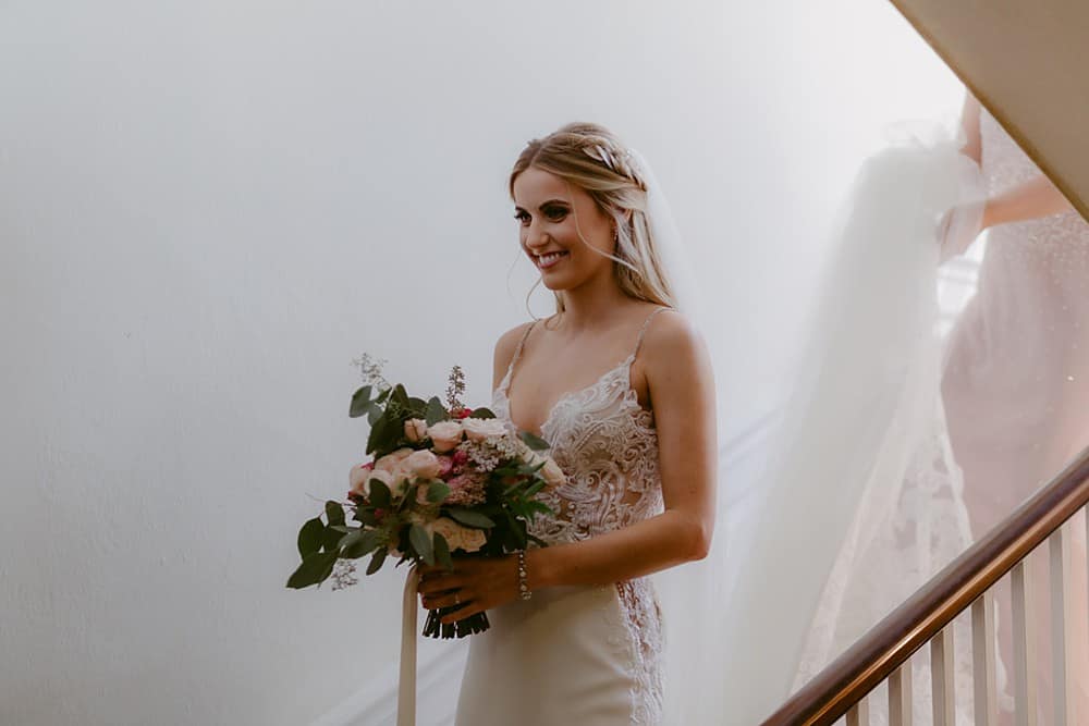My dress was called Lena by Enzoani. I chose this dress because I fell in love with the unique lace design and the long dramatic train. I accessorised with a veil that covered the length of the dress and I wore Swarovski jewellery, a dainty hair vine, and Carvela Kianni shoes to add touches of sparkle. Because my back was exposed, I had long tumbling curls down my back with half of my hair up in a fishtail braid. Abigail Constanza was my hair stylist who also styled my bridesmaids – they asked for their own unique hair dos. My makeup artist was Elle Hitchens who gave us a soft look to go with the summer feel of the wedding. Finally my bridesmaids wore blush pink Showcase dresses featuring sequins, halter necks and elasticated waists which were flattering for all of their different shapes.