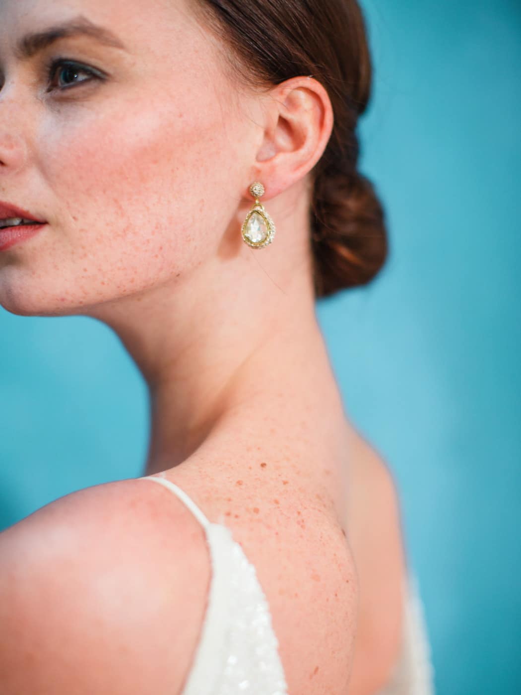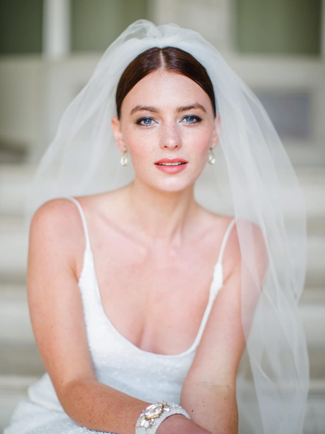 Inspired by bridal bouquets from the 1930’s Emma used an abundance of asparagus fern for our second bridal look. A simple mix of foxgloves, blossoming spirea and aquilegia didn’t complicate the soft ‘foam’ of the fern so a romantic cascade was achieved. Our beaded Clinton Lotter number looked divine against this frivolous floral statement and a classic blusher veil added that touch of tradition without compromising the overall look. Our Bride, Chelsea, has the most incredible blue eyes so we decided to go for full on smolder. A strong eye also works perfectly if you are choosing a veil such as this; you certainly want your boy to be looking into your eyes as you walk down the aisle! Pale blue suede heels from ASOS and bold drop earrings and matching cuff by St Erasmus from Liberty in Love completed our Bride’s style.