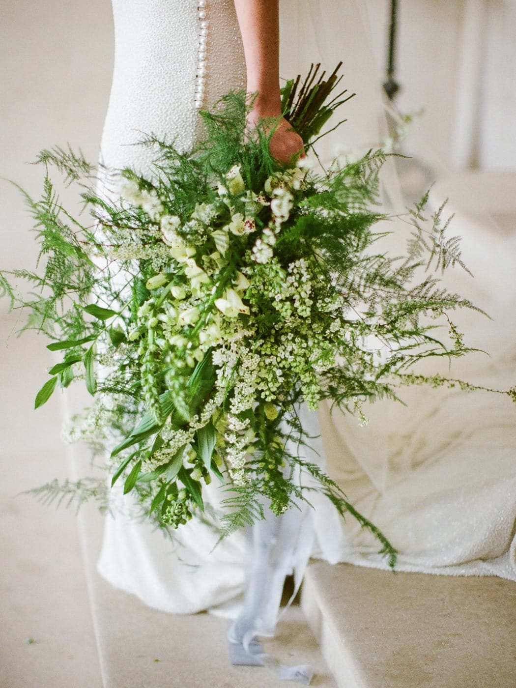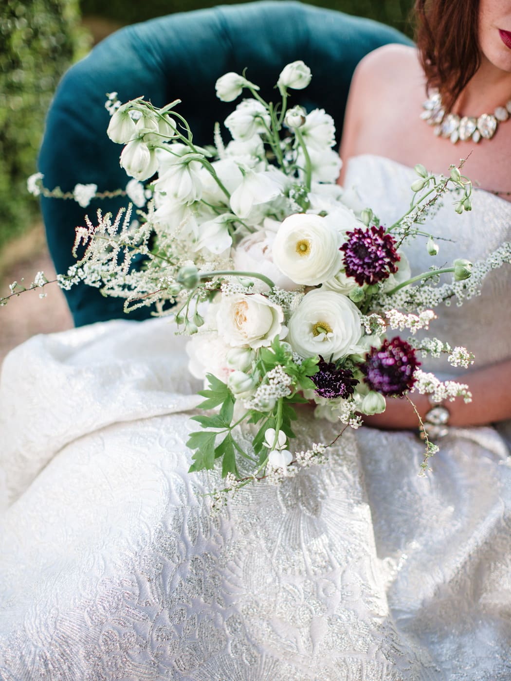 Our Bride gallivanted in the gardens wearing another Jesus Peiro gown with subtle silver brocade. The strapless neckline demanded a bold necklace and St Erasmus has some of the most decadent jewels I’ve ever seen. We adorned Chelsea with the crocheted Swarovski teardrop crystal necklace and matching bracelet. Our bold lip was mirrored by the pop of ‘black’ scabious in the third and final bouquet. The mix of peony, ranuculus, delphiniums, astilble, spirea, and garden rose looked wonderful in this soft hand tied bouquet, especially contrasted against the stunning blue of the sofa sourced by Elle at Inspire Hire. We finished the bouquet with bespoke hand-dyed soft blue silk ribbons by Kate Cullen.
