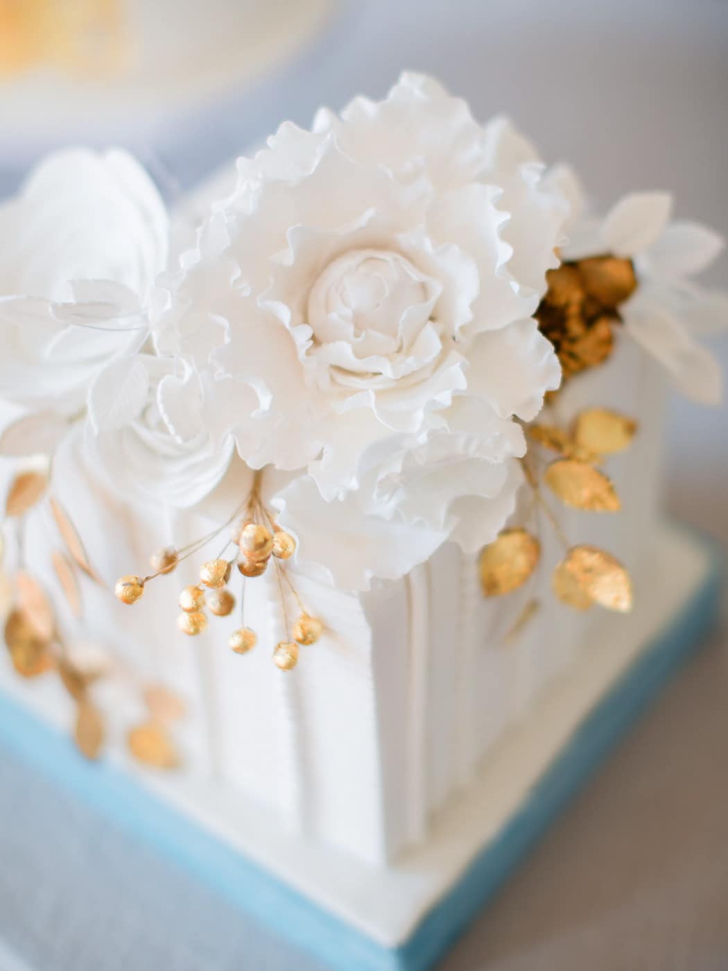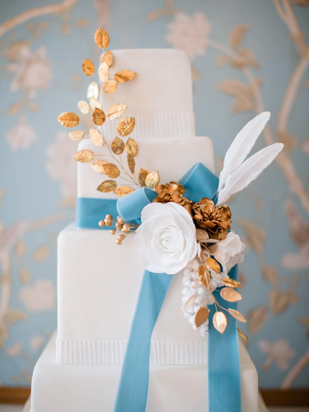 To finish, I simply must mention the cake table designed by Kate Burt Cakes. With not one, not two but seven gorgeous cakes it was quite the luxury statement. A white croquembouche was flagged by twin hand-painted cakes, a simple 3-tier iced cake was decorated with a painted gold stripe and the master of ceremonies, a square 5-tier cake, stood in all its glory with blue velvet ribbon, gold sugar flowers and a crisp white feather. You are spoilt for choice at Pynes House for places to display your wedding cake, but we did rather fall in love with the blue alcove – a stunning spotlight for your sugary treat.