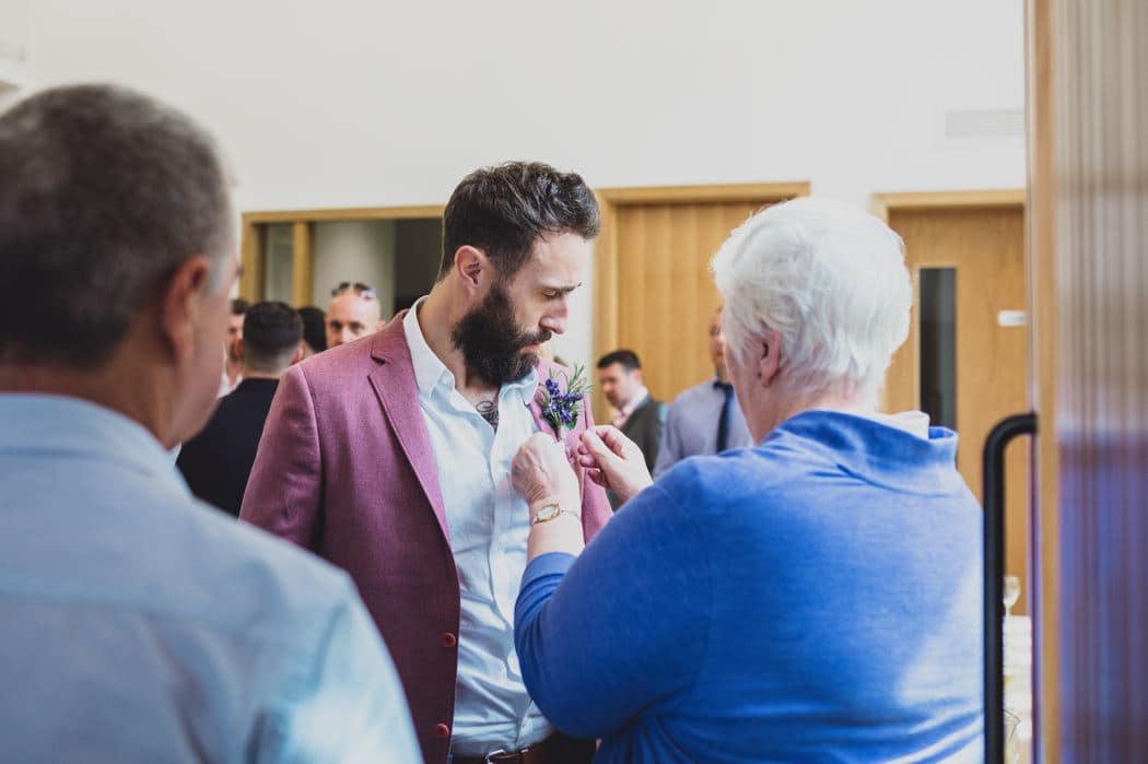 Not many grooms could pull off a multi-tone suit with berry jacket, but mine could! All purchased from the wedding shop on ASOS (great budget saver)! Navy pants, white shirt, brown leather accessories and finished with a berry suit jacket and great big beard – how handsome.