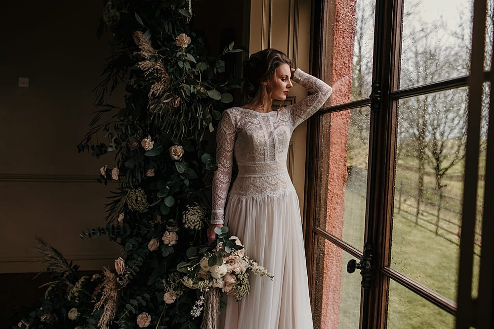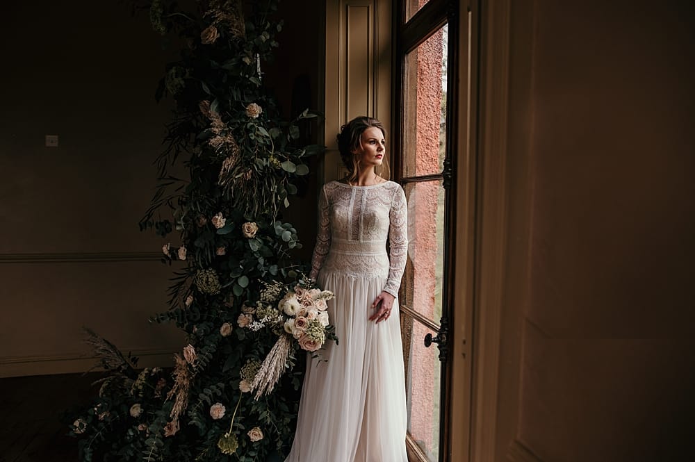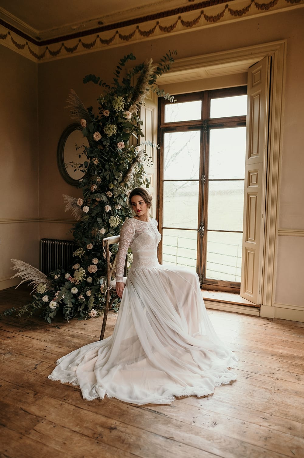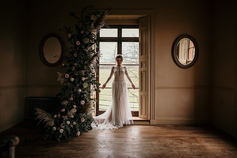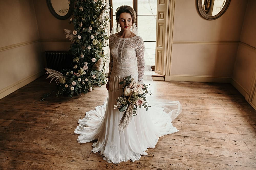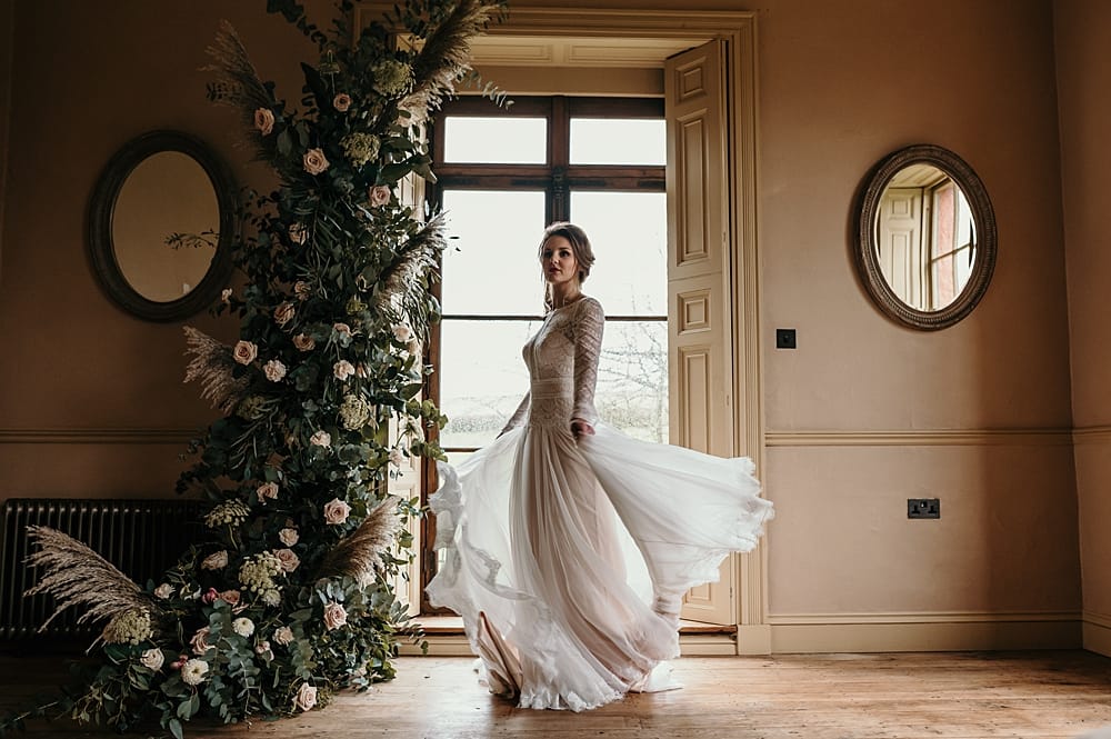 Floral design by Rebecca Kate Flowers featured Pampas grass, greenery and roses in dusky pinks and soft ivory hues. The nude colour palette was the perfect match for the Ballroom, offering our couples an insight into how understated floral styling can transform a space. Combining elegant roses with fresh florals and foliage helped to give a wildly romantic vibe to our shoot.
