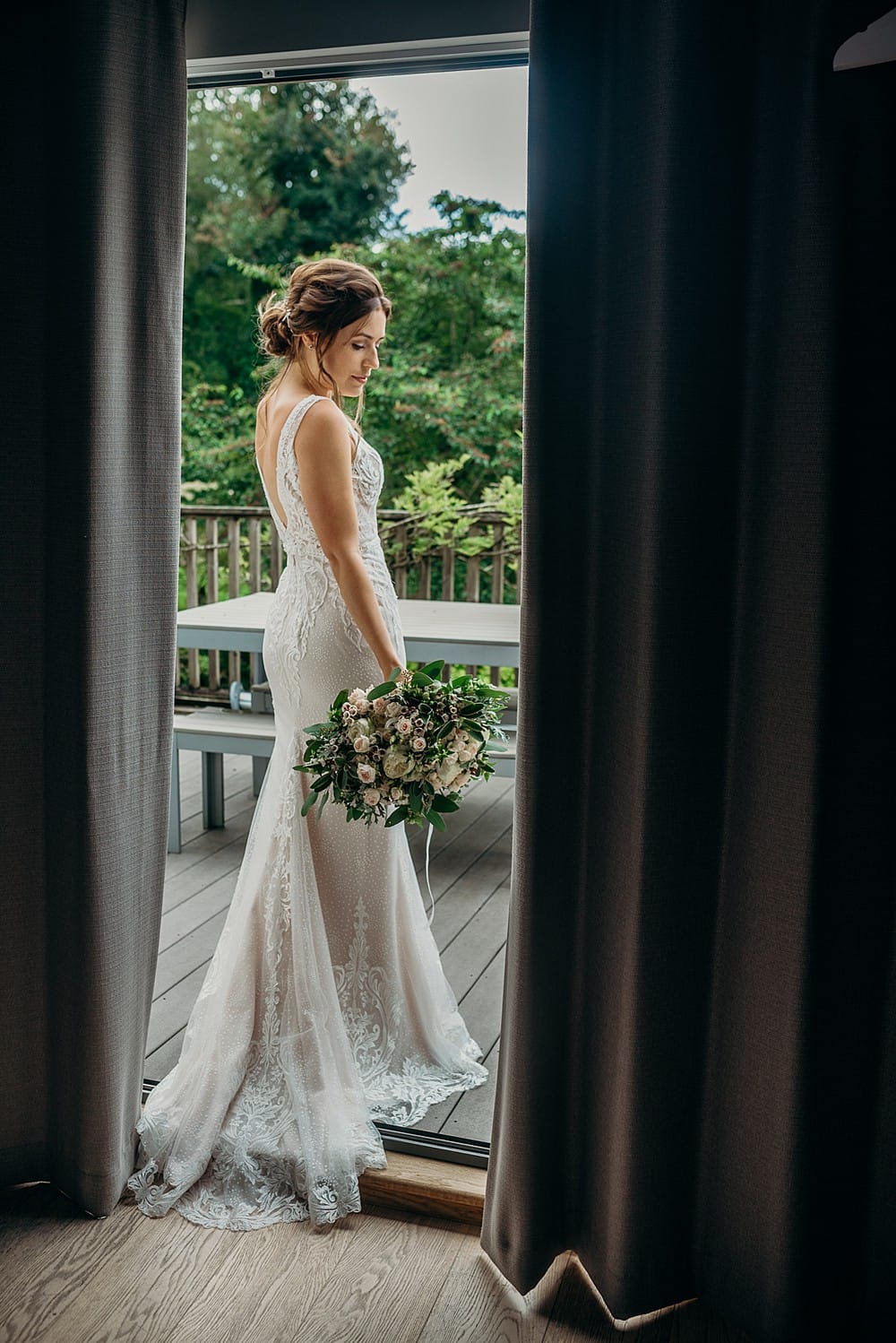 My dress was by Enzoani. I was drawn to the plunge neckline and the unique polka dot pattern which I hadn’t seen on any other dresses. I also loved the train which I had made detachable and wore just for the forest photos. The train made me feel like I had two dresses! Without the train my dress felt sleek and elegant. With the train it felt like more of a statement dress with more wow factor. I’m so pleased with how it looked in the forest photos and that I got to enjoy wearing it both ways.