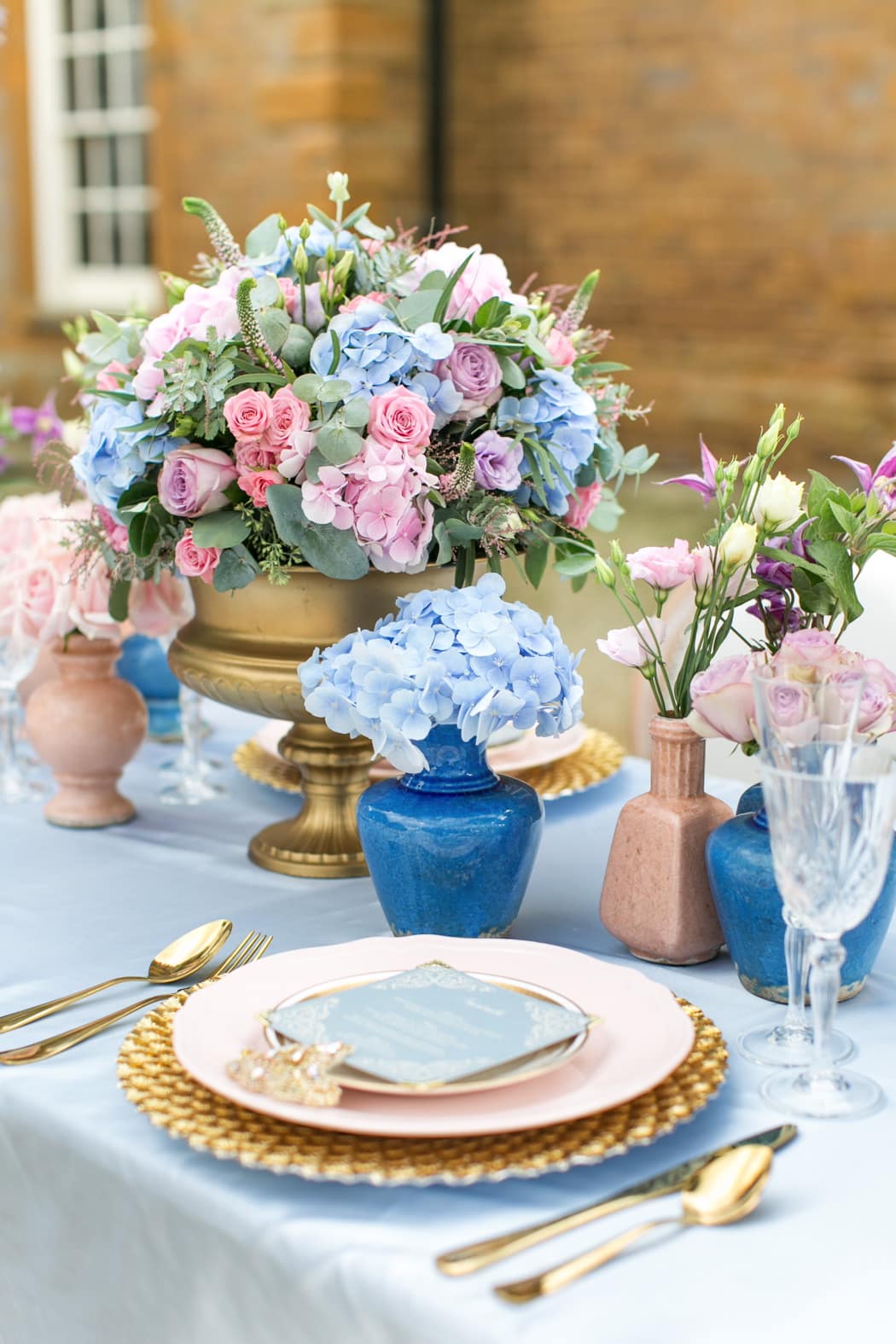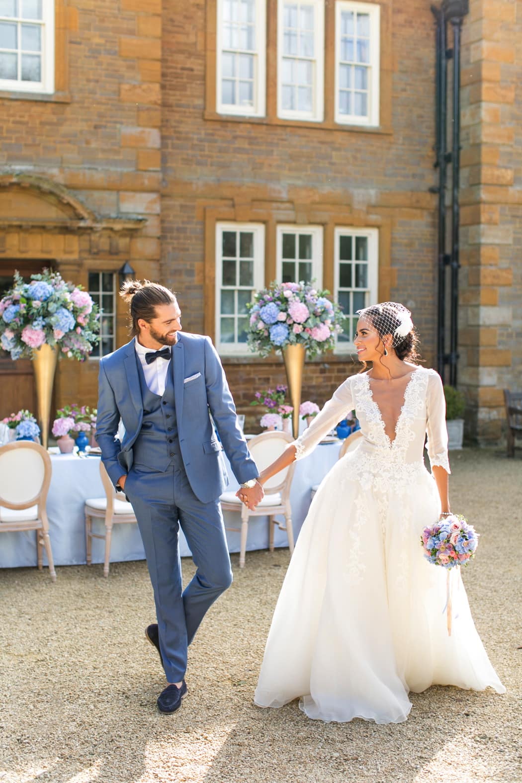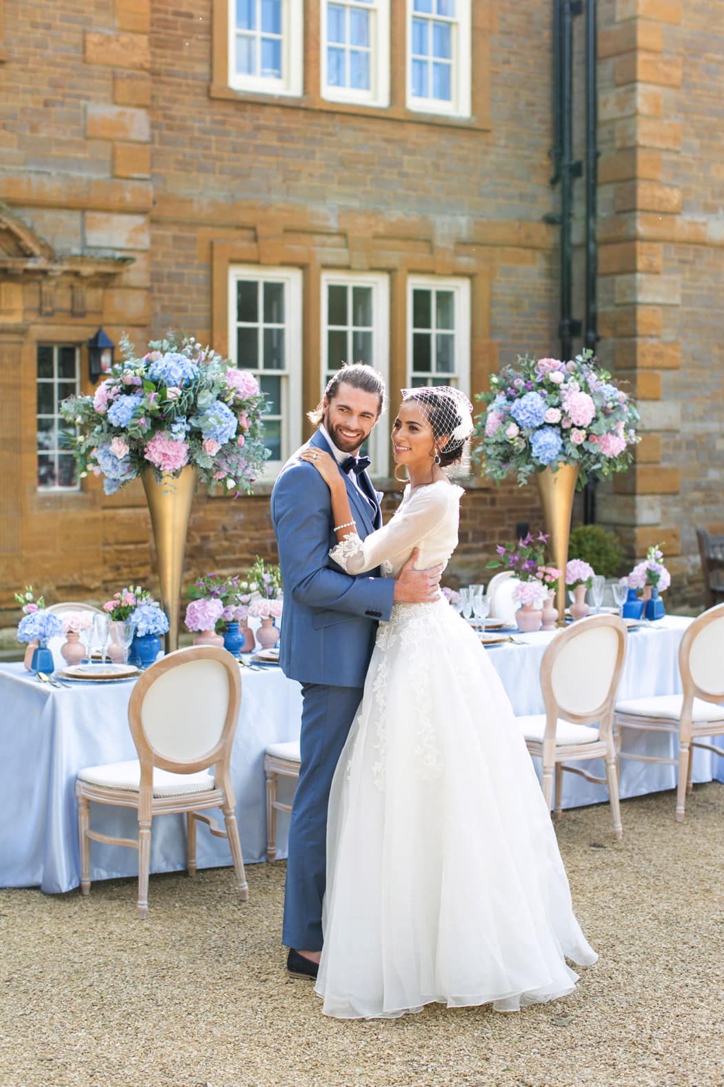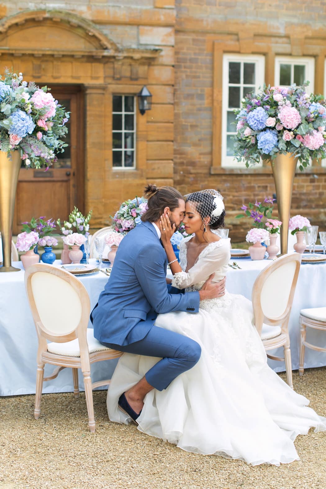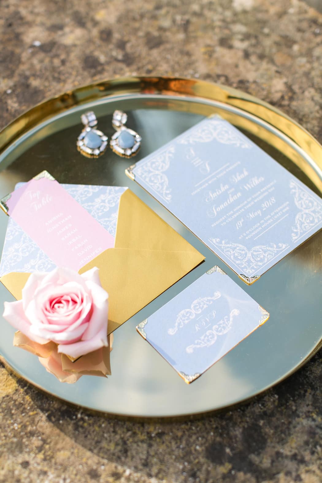 Reminiscent of an English summer’s day, the pastel palette was the inspiration for the setting. Soft heavenly ice cream shades infused with darker vibrant metallic of blue and greys. The delicate rose pink and muted golds contrasted perfectly against palest baby blues and gentle creams of the décor. The gorgeous gold beading on the wedding outfit of our bride lifted from the flowing blush pink organza gown – so delicate and intricate, perfect for a summer wedding.