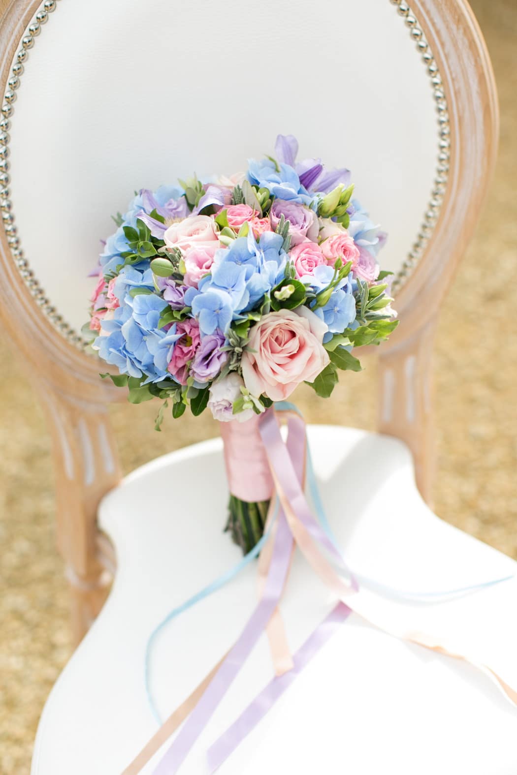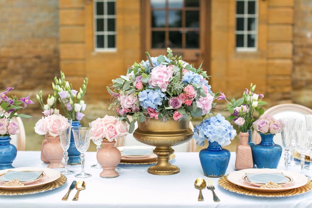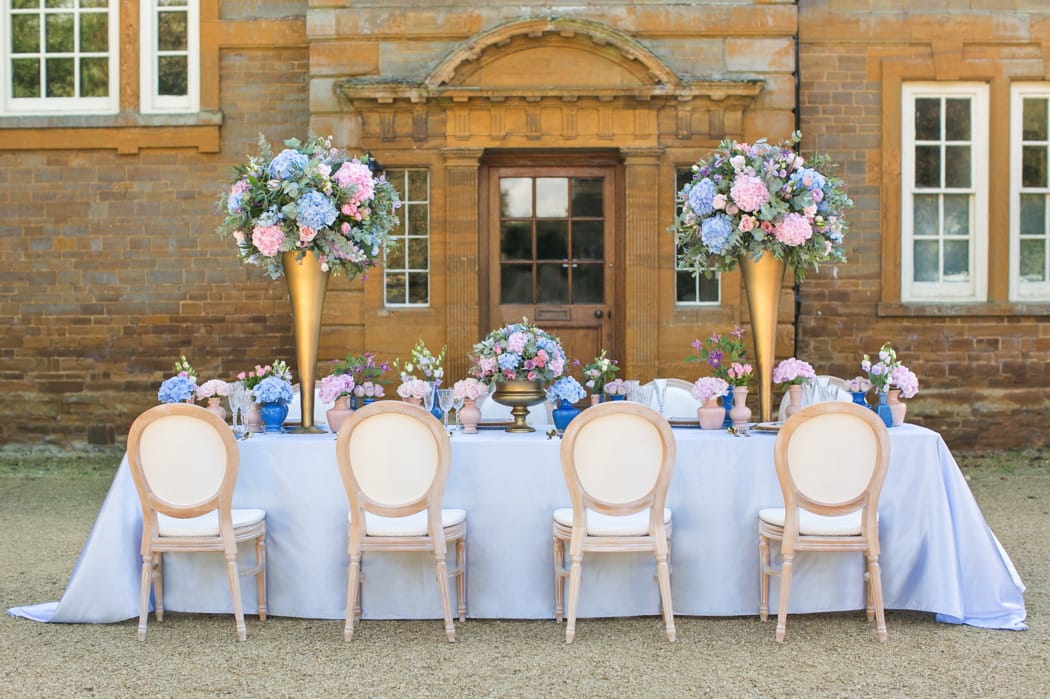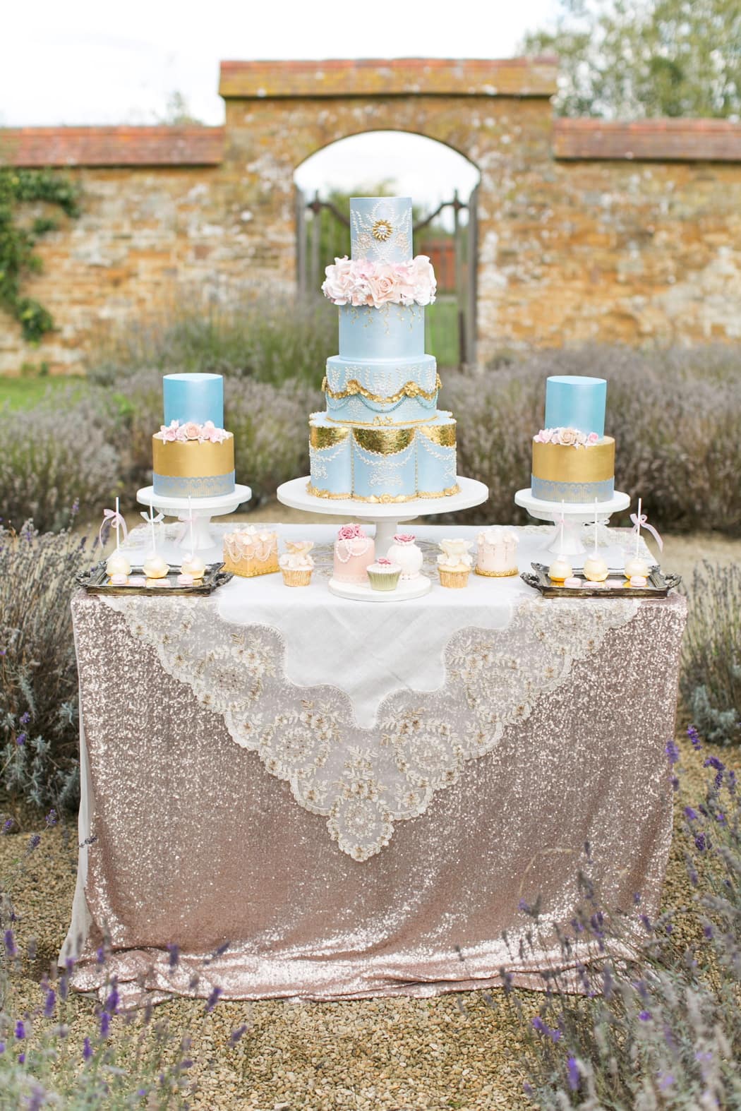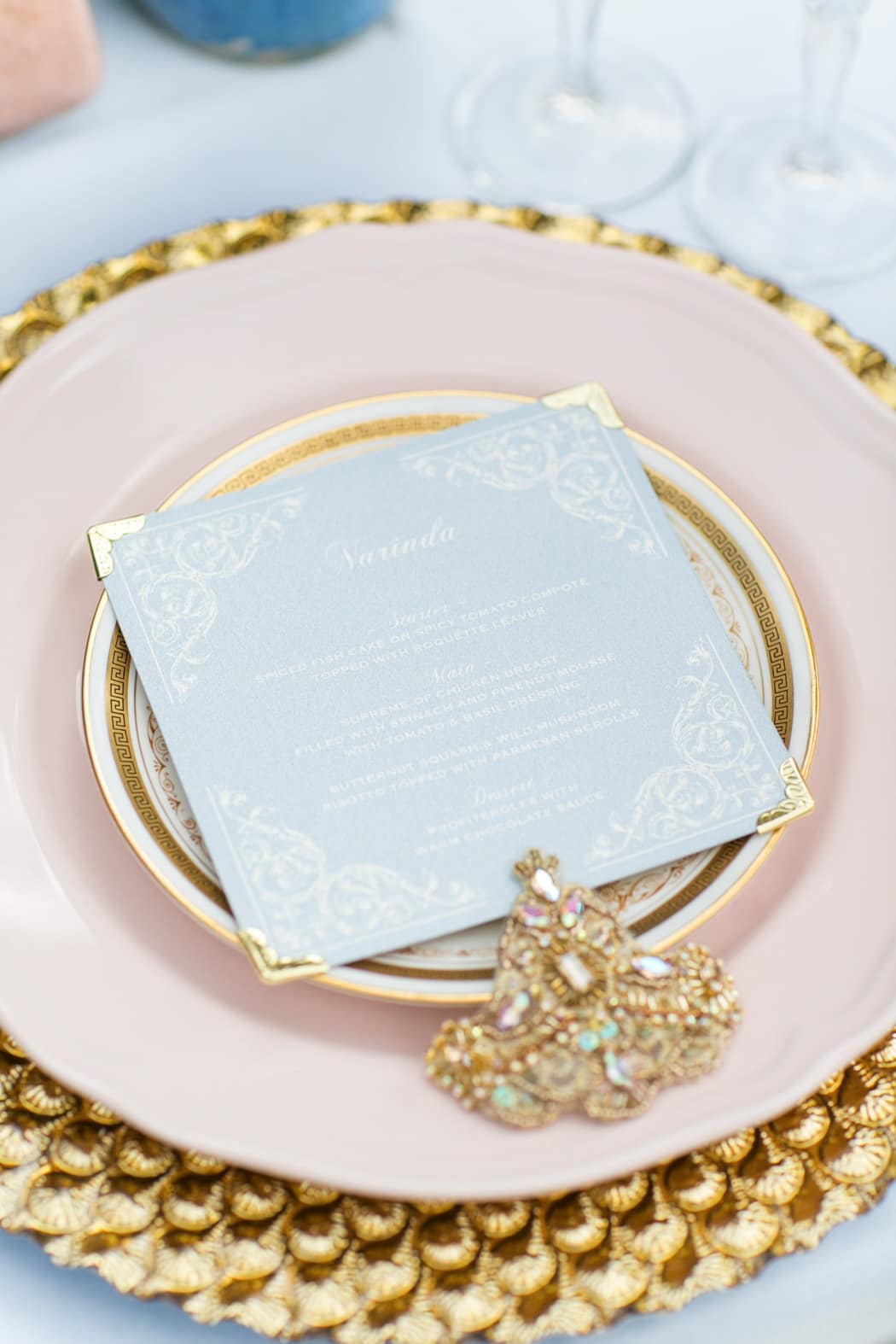 Reminiscent of an English summer’s day, the pastel palette was the inspiration for the setting. Soft heavenly ice cream shades infused with darker vibrant metallic of blue and greys. The delicate rose pink and muted golds contrasted perfectly against palest baby blues and gentle creams of the décor. The gorgeous gold beading on the wedding outfit of our bride lifted from the flowing blush pink organza gown – so delicate and intricate, perfect for a summer wedding.