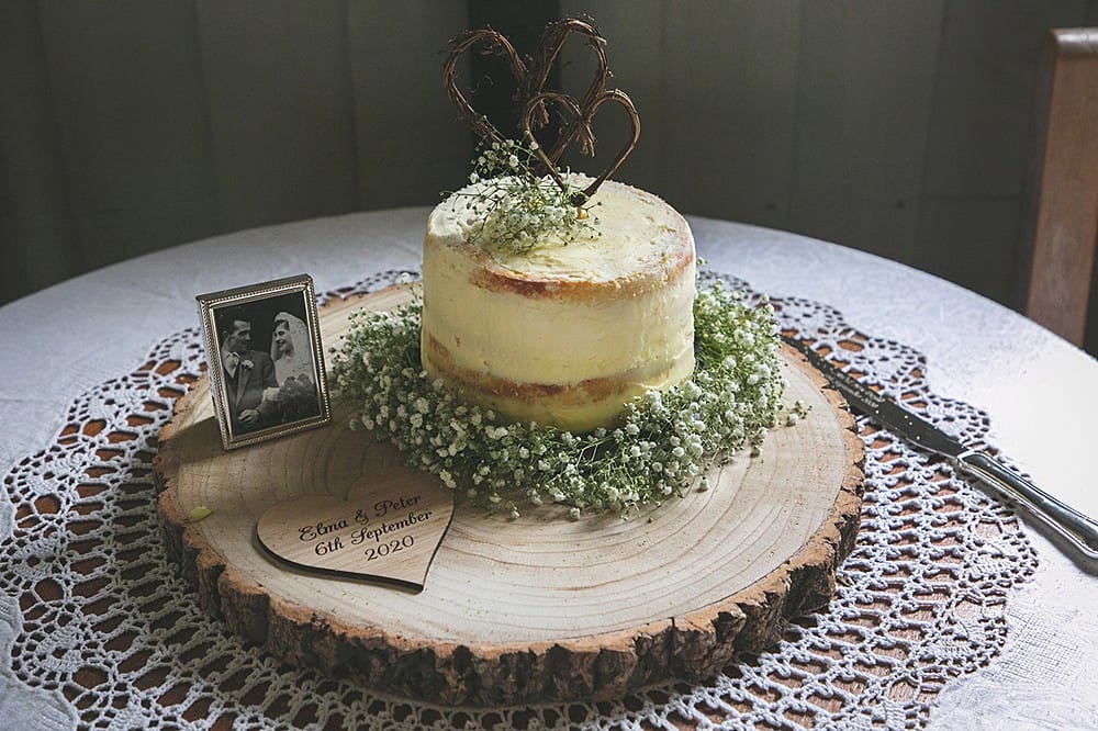 I made our cake. It was a mini version of the cake we had planned for our postponed wedding. It was a semi-naked gluten free vanilla sponge and buttercream with apricot jam. I also made the vine heart toppers which looked just lovely with the rustic log cake slice.