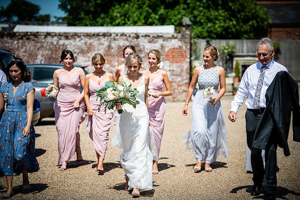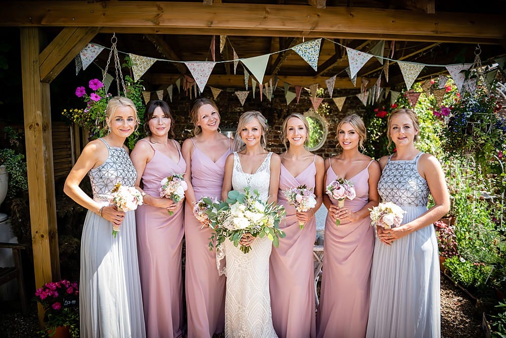 The flowers were provided by the wonderful florist on site at the venue, Anemone Blue. I can’t explain how handy and convenient it was to have the florist so nearby and be able to help with every detail on the day. We opted for soft peach and pink flowers, combined with dusky green foliage to compliment the dresses and the wild garden surroundings. Aside from the bridesmaid bouquets which I created myself, Anemone Blue provided everything from the table flowers and huge garland to my beautiful bouquet and hair flowers.