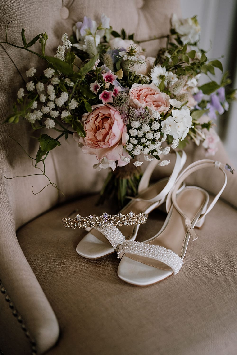 I felt the venue spoke enough for itself, but a vague theme was that of a carefree and idyllic summer day, for which the venue and time of year did all the work. I wanted to honour the English countryside and wildflowers, so we had locally grown flowers within the bouquets and buttonholes. Natural and whimsical flower arrangements decorated the church entrance and Carriage House, where we had the wedding breakfast. I felt this approach worked in harmony with the venue, in particular the hall’s beautiful gardens. Our wonderful stationer, Maddy of Rose & Beau, encapsulated this vibe perfectly with her elegant floral designs on our invitations, and running through into our welcome signs and orders of service.