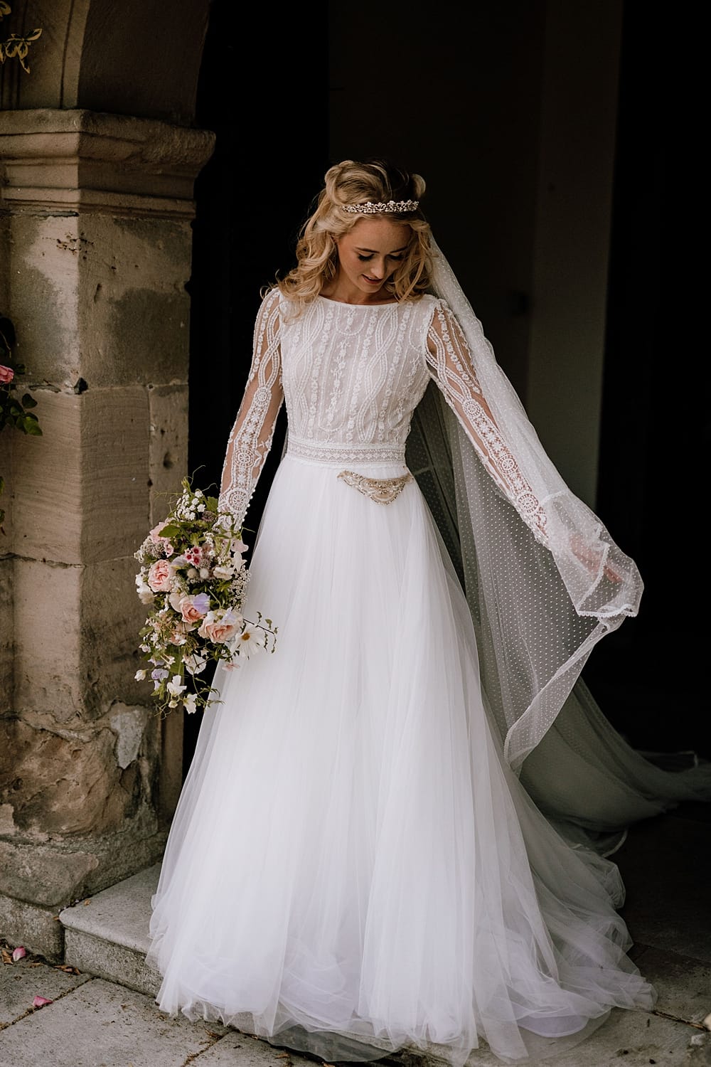 I found my dream dress at Rosa Clara in London. All of their dresses have such a classic and ethereal style, so I knew I would find ‘the one’ there. I thought I would want a V-neck, cap sleeved gown, but as soon as I wore my long sleeved, high necked dress, I knew it was the right one. I wanted the dress and my beautiful engagement ring to be the centre of attention, so I kept other jewellery simple – just a subtly sparkling tiara and earrings. Very important was a piece of vintage lace as my ‘something old’, which was pinned to my skirt. It belonged to my great great aunt and was part of her wedding veil, so this was a special touch.