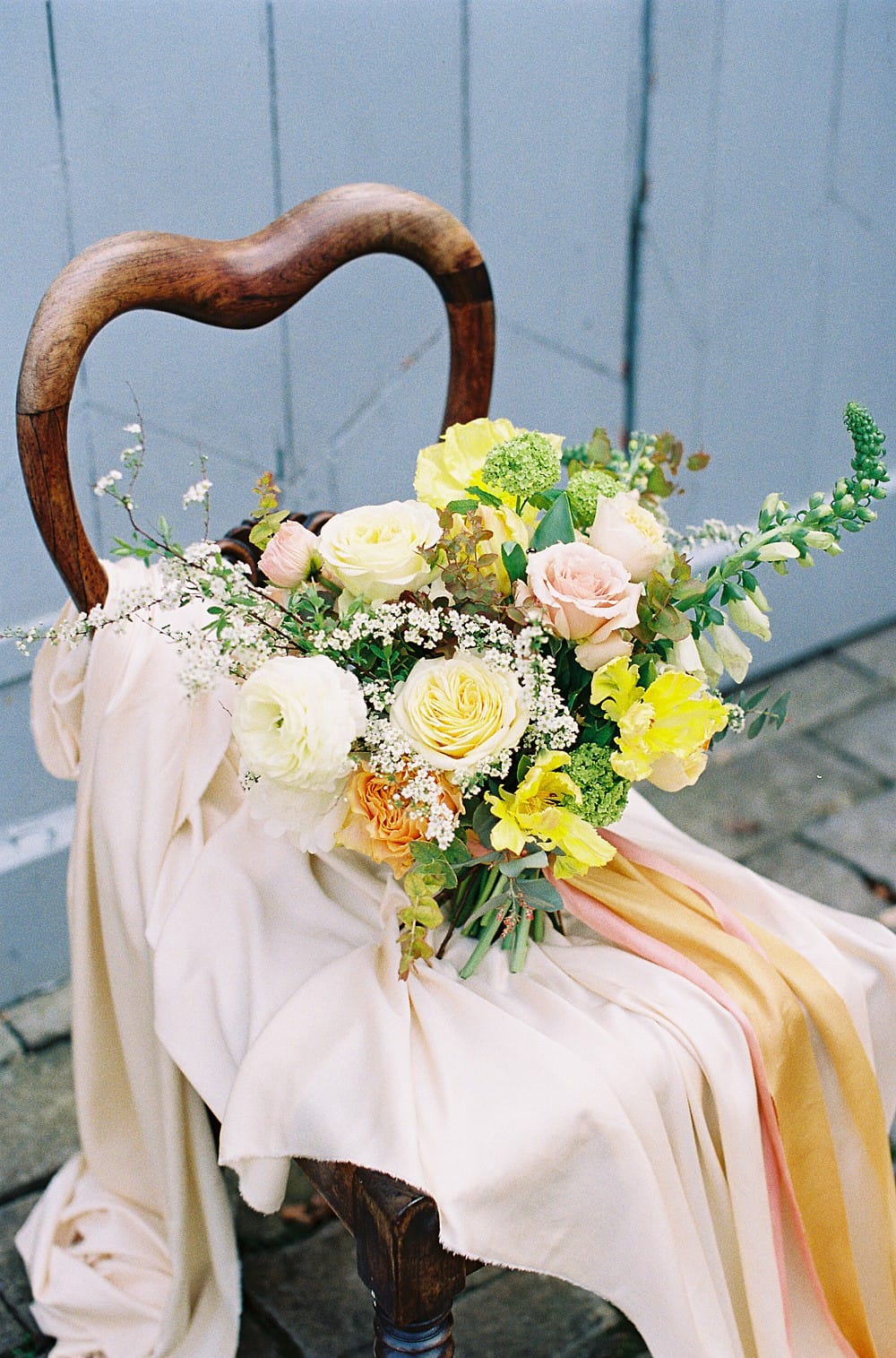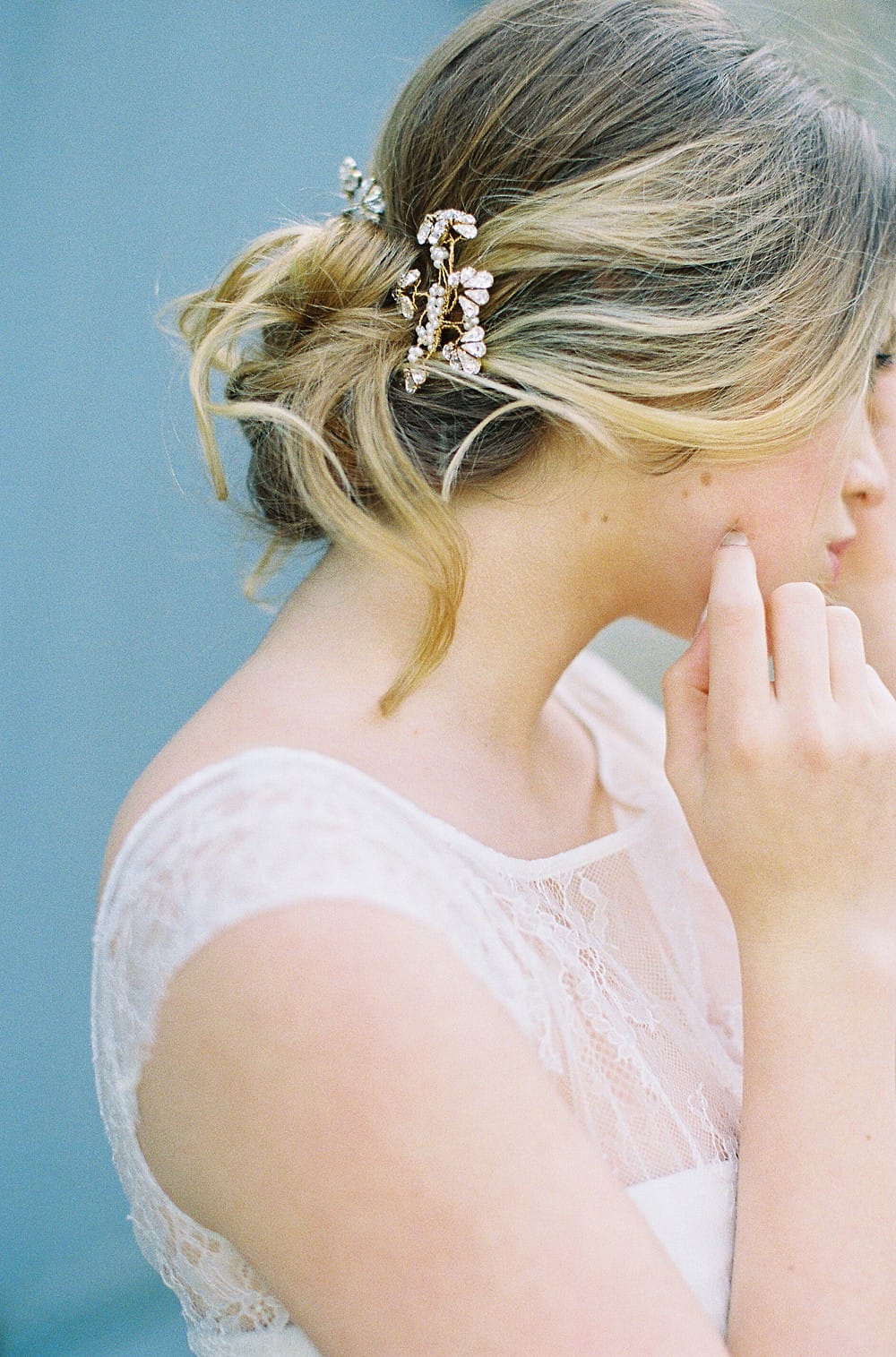 Going gently on the senses with a warm but pared-back palette of yellow, gold and a touch of blush, with the finest of barely-there makeup and tousled hair from Tracy Pallari. Going gently on fashion with an elegant Chantilly lace dress handmade by Naomi Neoh London and intricate hand-crafted accessories by Victoria Fergusson. Going gently on nature with seasonal and foraged florals from Grace at Bramble & Wild, and artisan silks hand-dyed in Cornwall with cinnamon and turmeric by Sian of Lancaster & Cornish.
