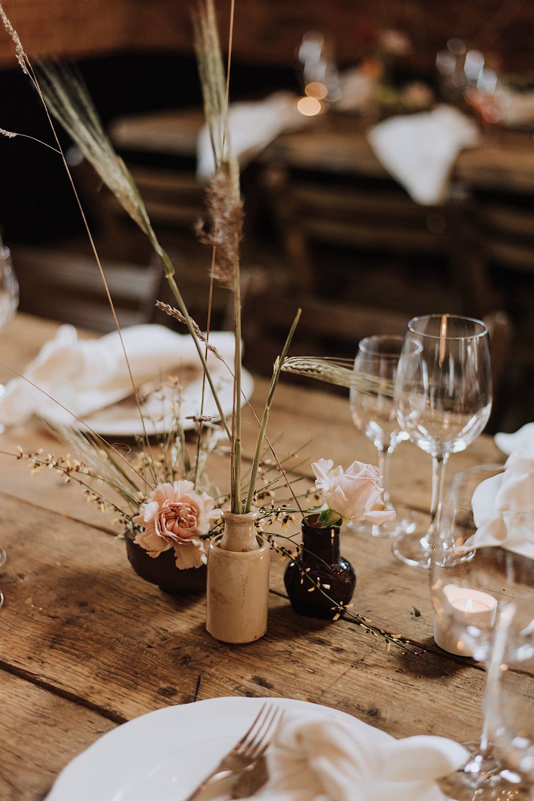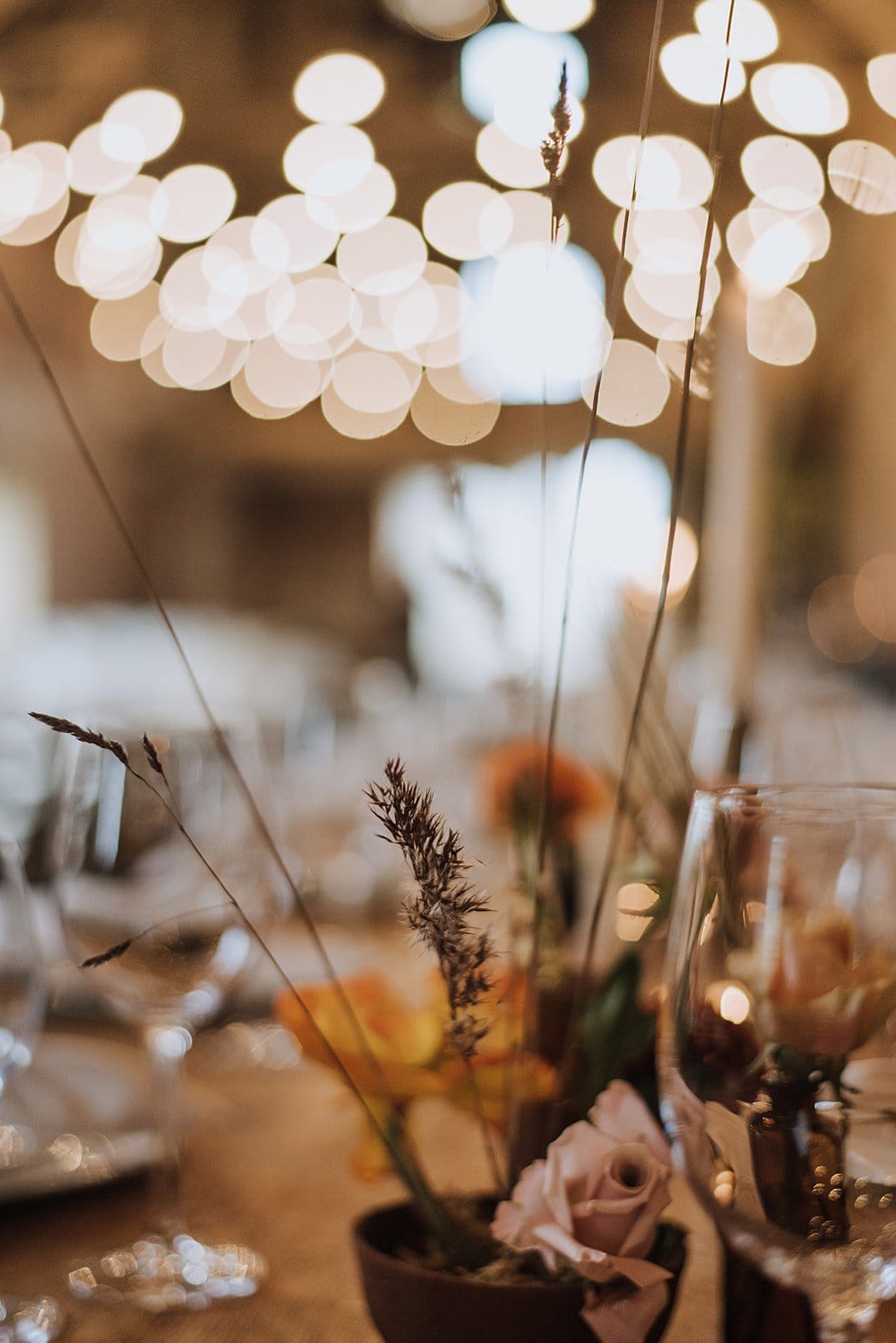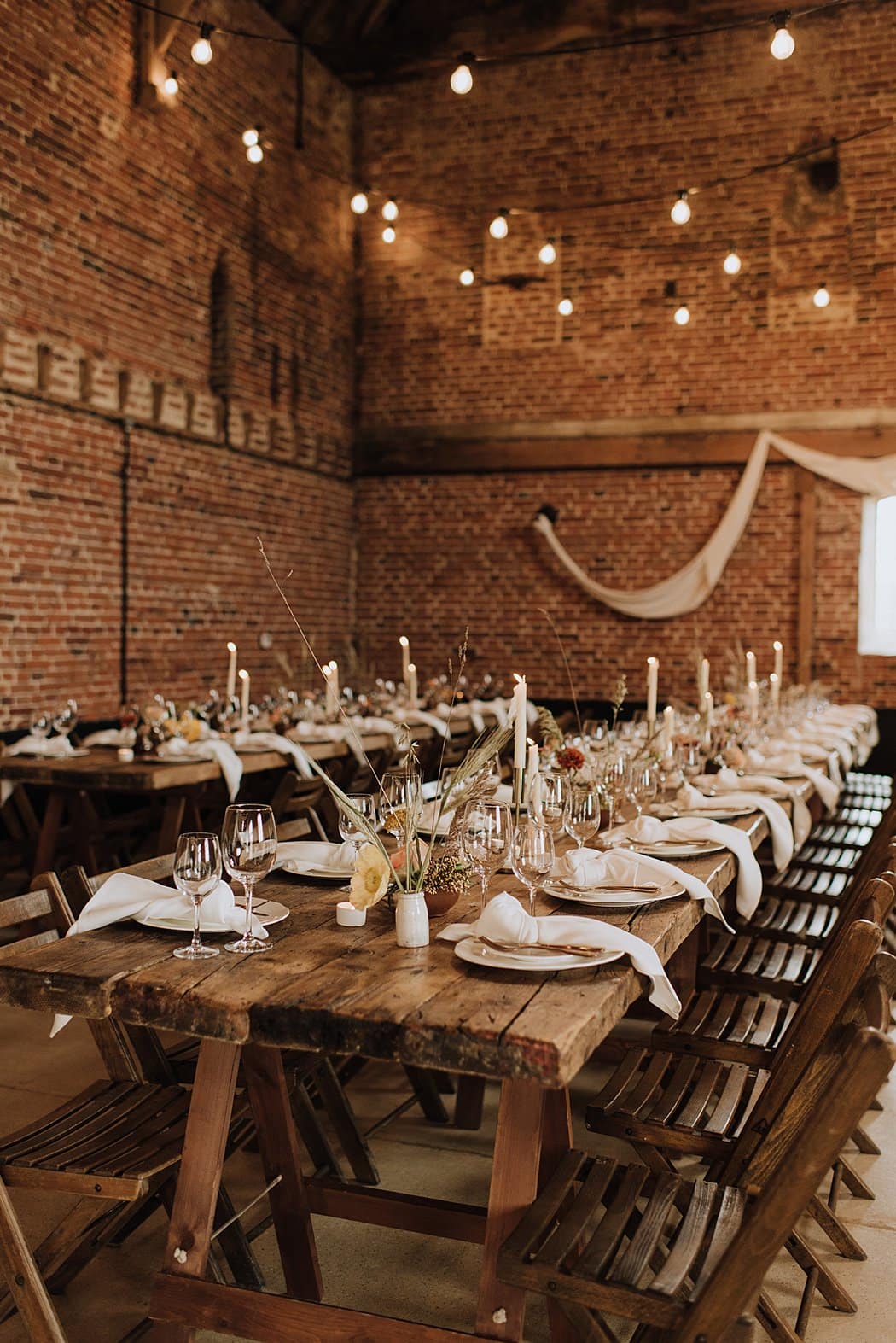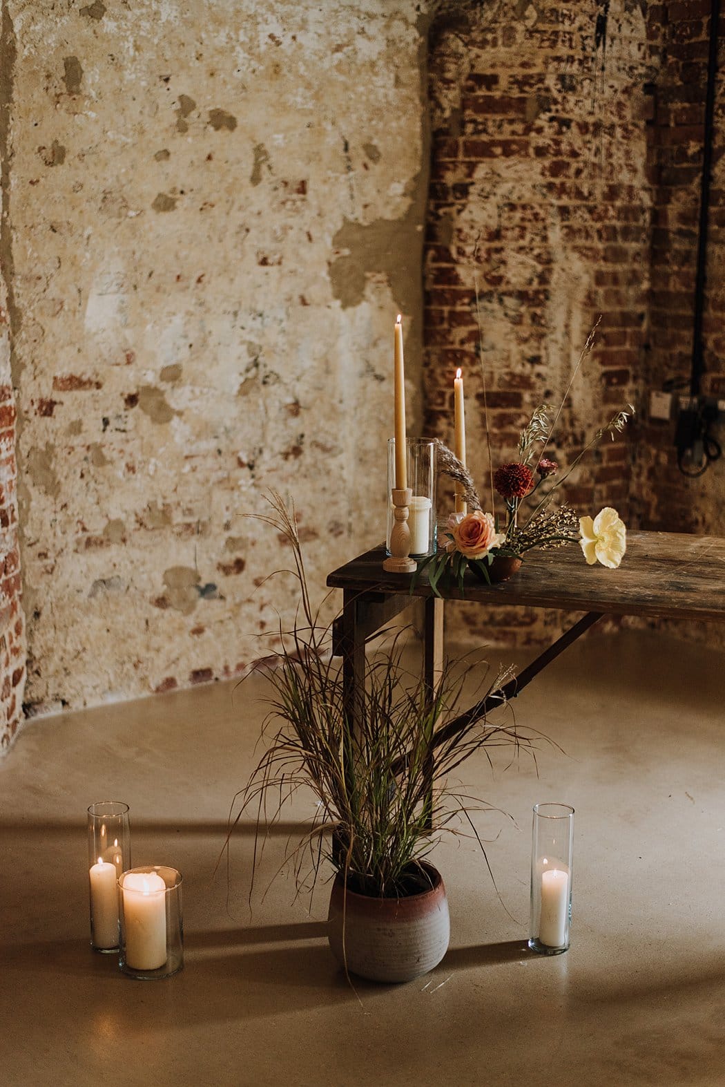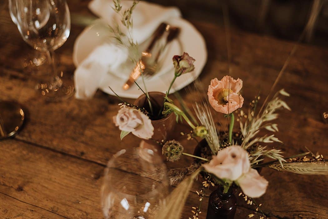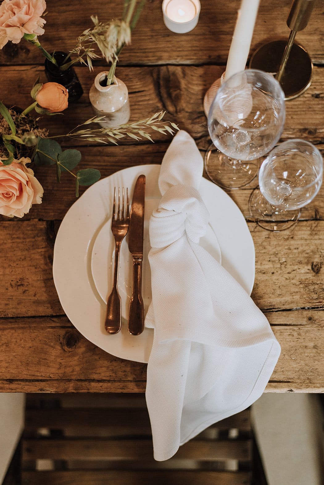 Godwick’s rustic trestle tables were set up for tablescape inspiration and dressed with low terracotta dish arrangements and ceramic and amber glass bud vessels to give depth and tone in little clusters. CMA Hire provided copper cutlery and white crockery for a modern rustic appeal that combined with knotted napkins for a relaxed and organic look. The copper cutlery combined beautifully with brass, gold and pale wood candlestick holders from The Little Lending Company.