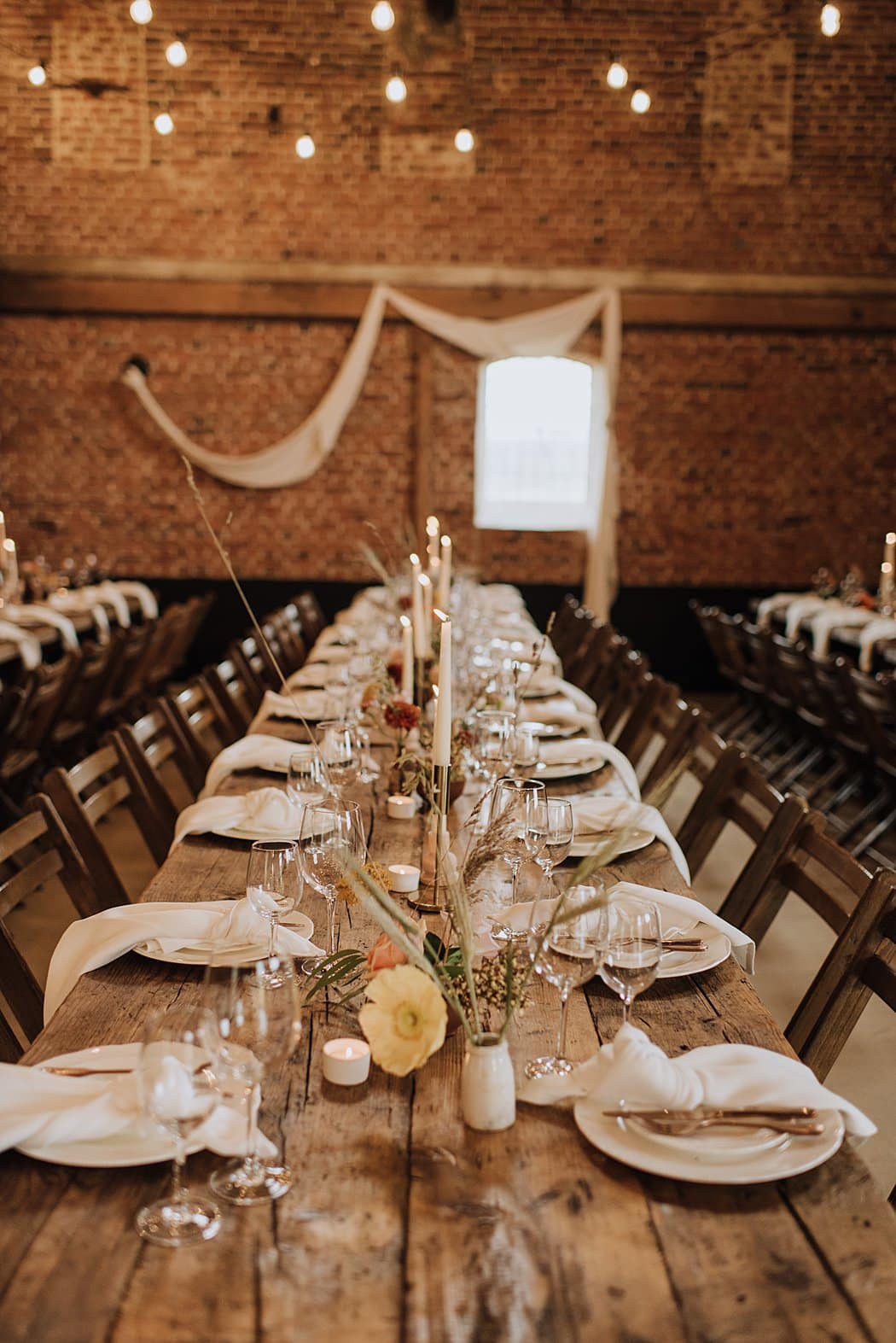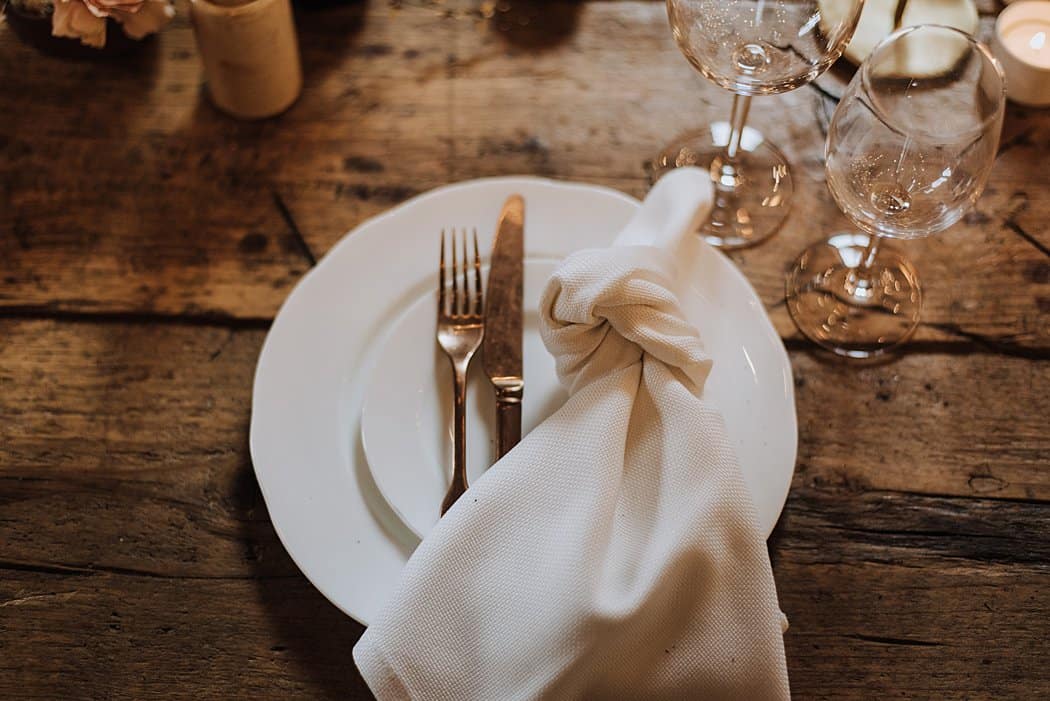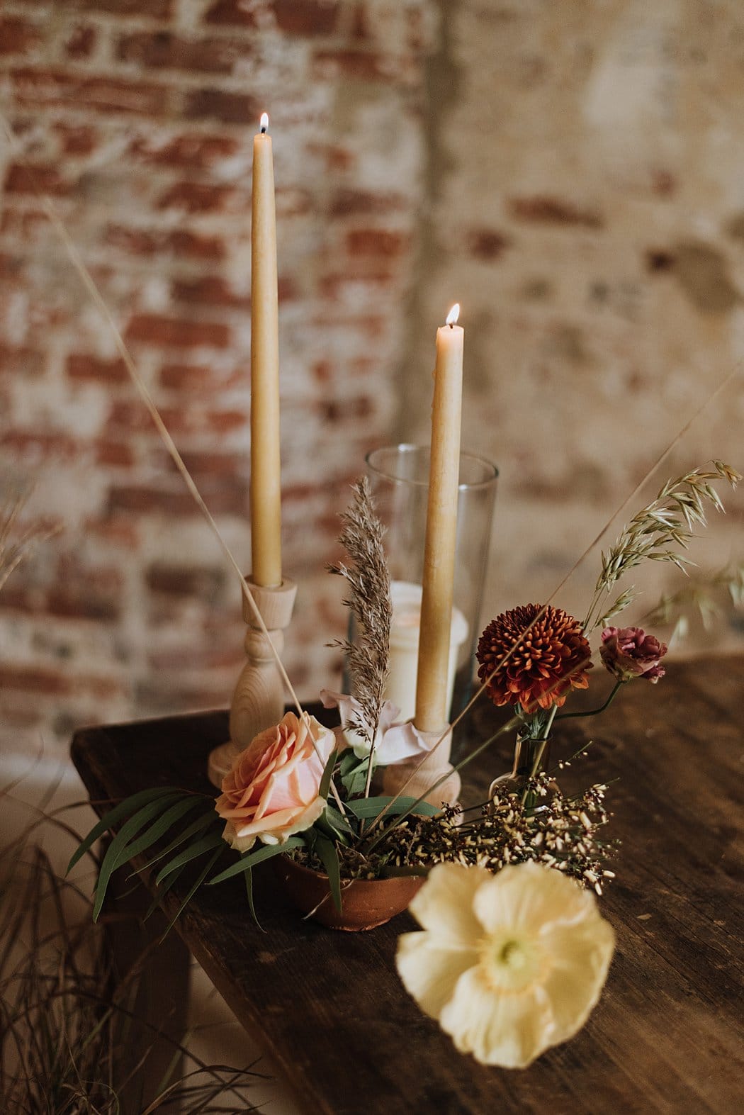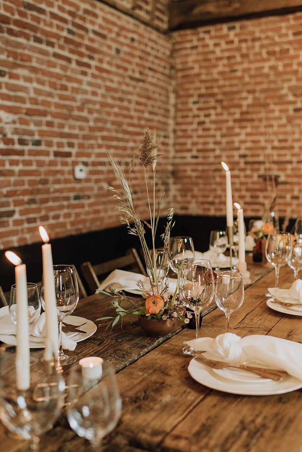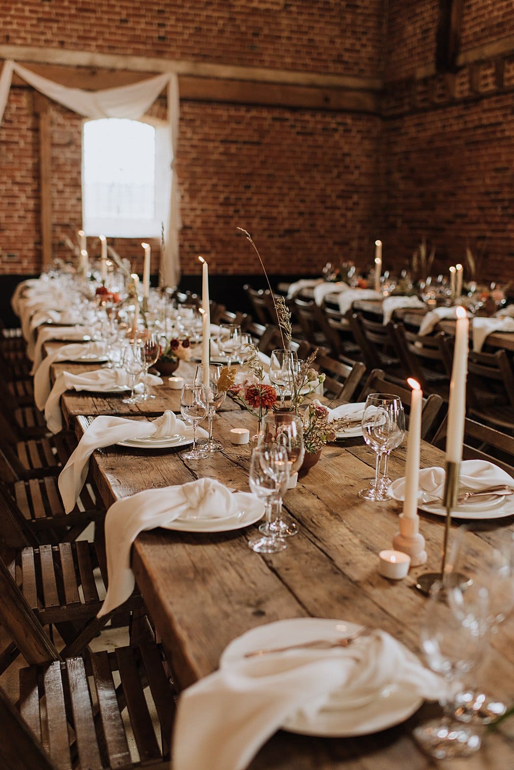 Godwick’s rustic trestle tables were set up for tablescape inspiration and dressed with low terracotta dish arrangements and ceramic and amber glass bud vessels to give depth and tone in little clusters. CMA Hire provided copper cutlery and white crockery for a modern rustic appeal that combined with knotted napkins for a relaxed and organic look. The copper cutlery combined beautifully with brass, gold and pale wood candlestick holders from The Little Lending Company.