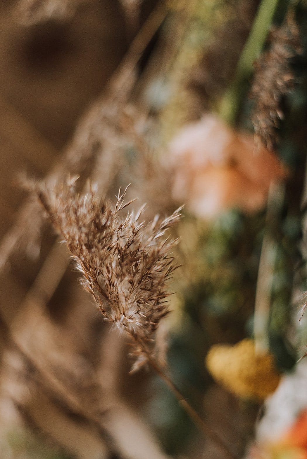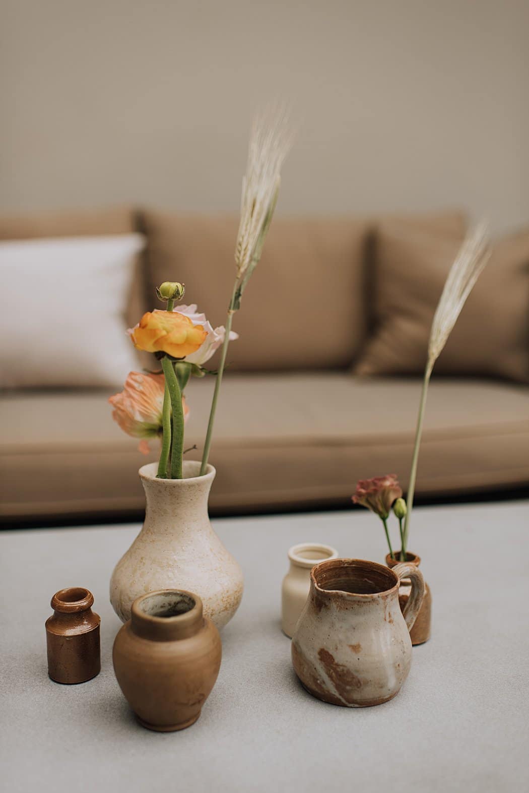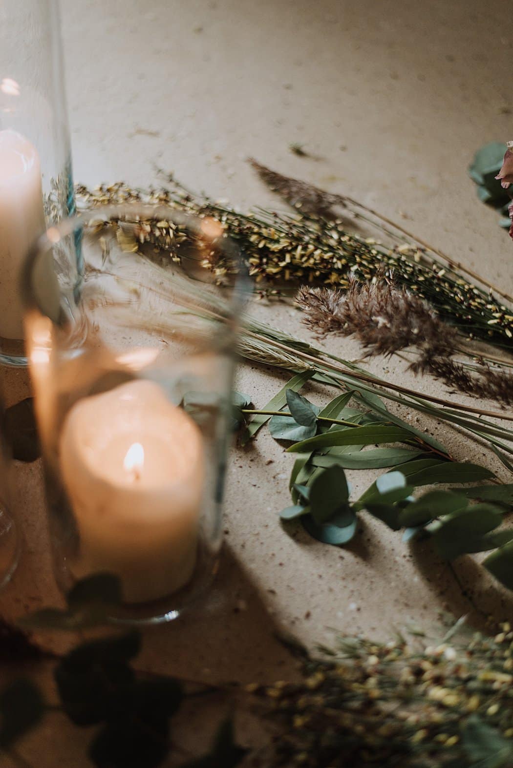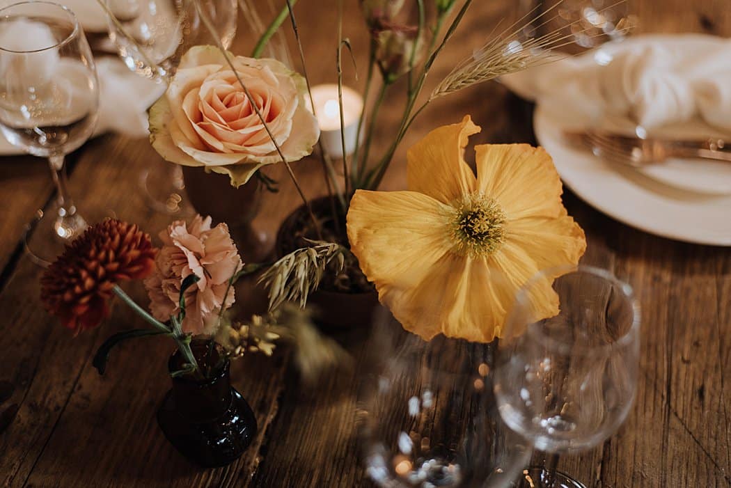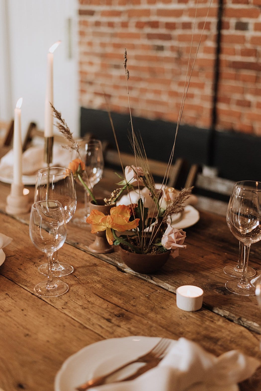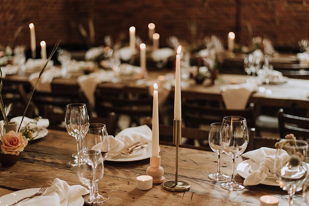 Godwick’s rustic trestle tables were set up for tablescape inspiration and dressed with low terracotta dish arrangements and ceramic and amber glass bud vessels to give depth and tone in little clusters. CMA Hire provided copper cutlery and white crockery for a modern rustic appeal that combined with knotted napkins for a relaxed and organic look. The copper cutlery combined beautifully with brass, gold and pale wood candlestick holders from The Little Lending Company.