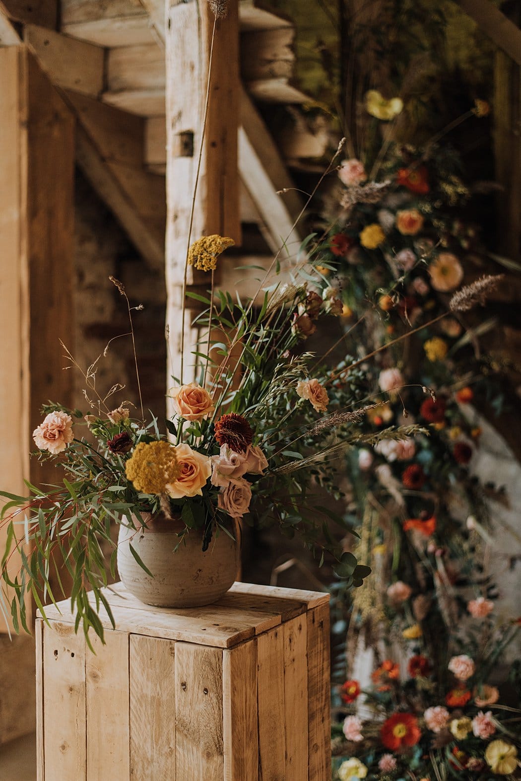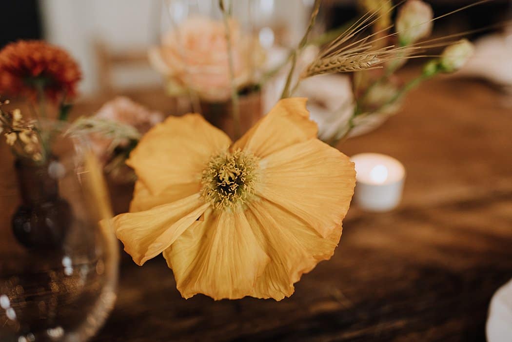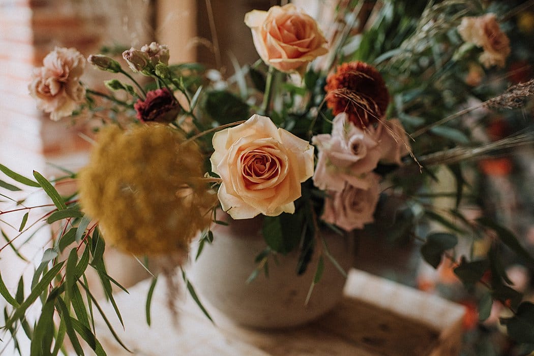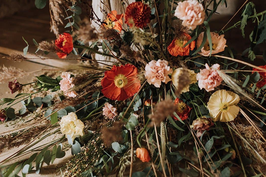 Penny from The Little Lending Company collaborated with Swaffham and Fakenham Florist to develop an interior concept based on the warmth and texture of the new polished concrete floor. “The floor’s tones were the starting point,” said Penny. The collaborators opted for a mix of bright poppies, eucalyptus, dried flowers, grasses, dusty pink carnations, rusty chrysanthemums with roses and ginster providing a fabulous colour palette. Penny continues “The dried elements really complemented the soft natural colour of the floor”.
