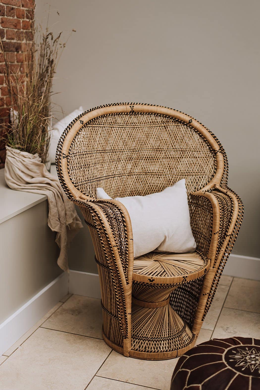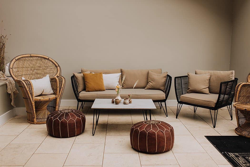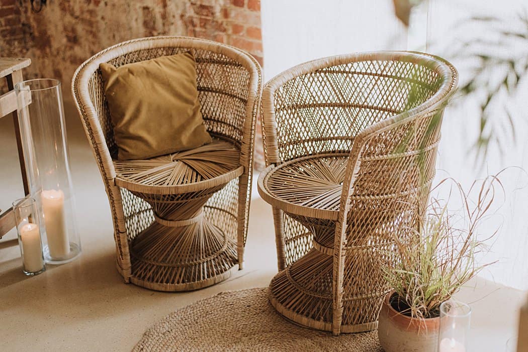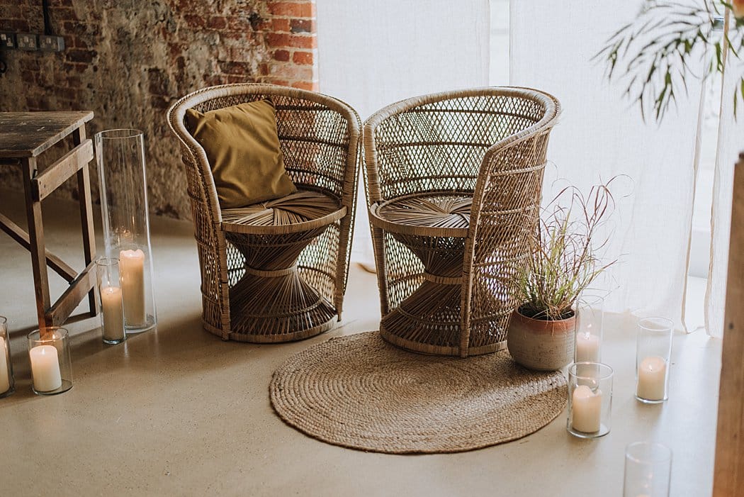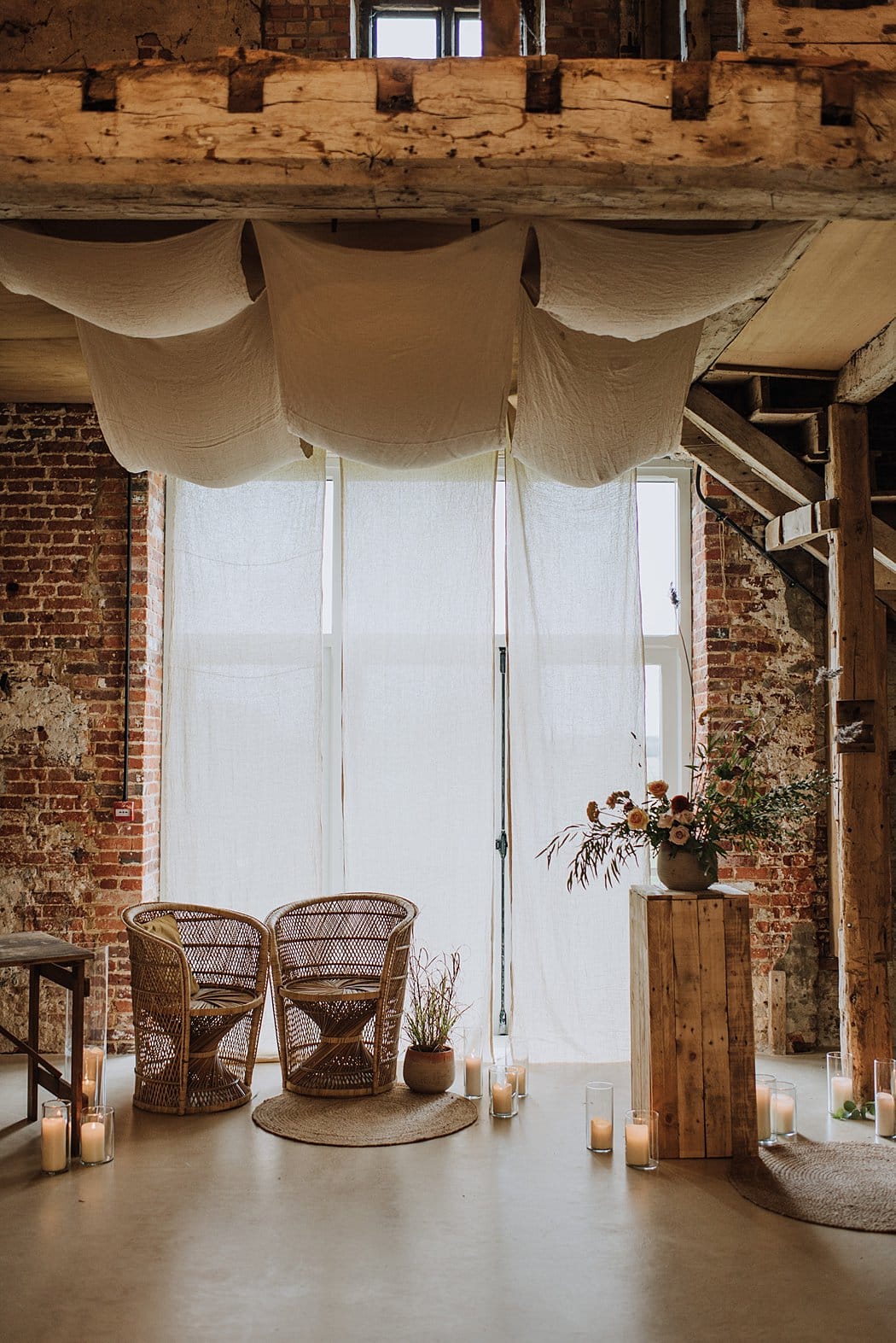 “We arranged pale wood plinths and wicker tub chairs for the newlyweds and we softened the door light with a series of hanging drapes.” added Penny.