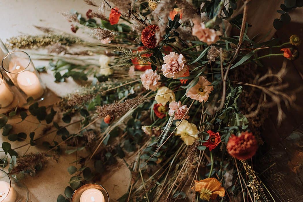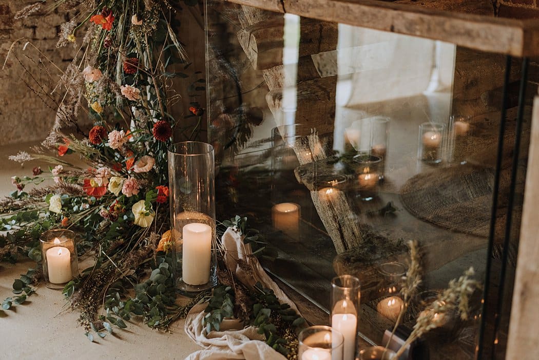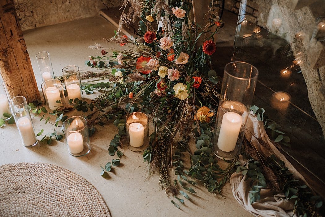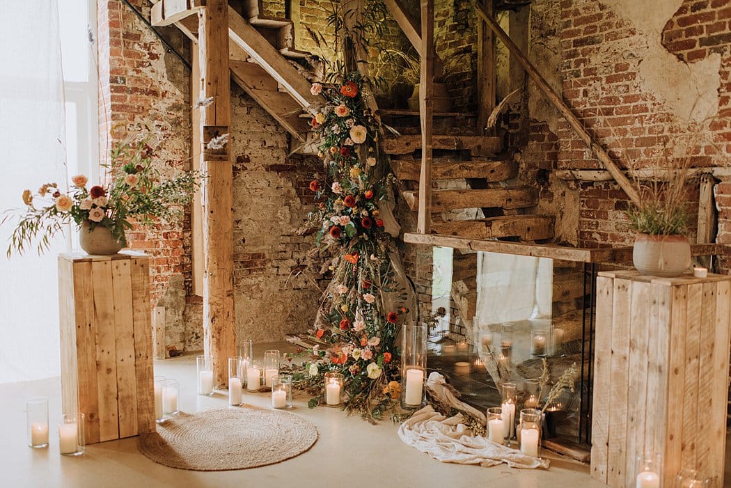 The ceremony set up was angled at the uncovered 400-year-old staircase with a curved aisle, providing a new and interesting focal point. The florals cascaded from the old wooden staircase to the floor where they met a natural linen base with candles surrounding rattan rugs where the couple would stand. The candlelight and the shine of the floor metered subtle reflections.