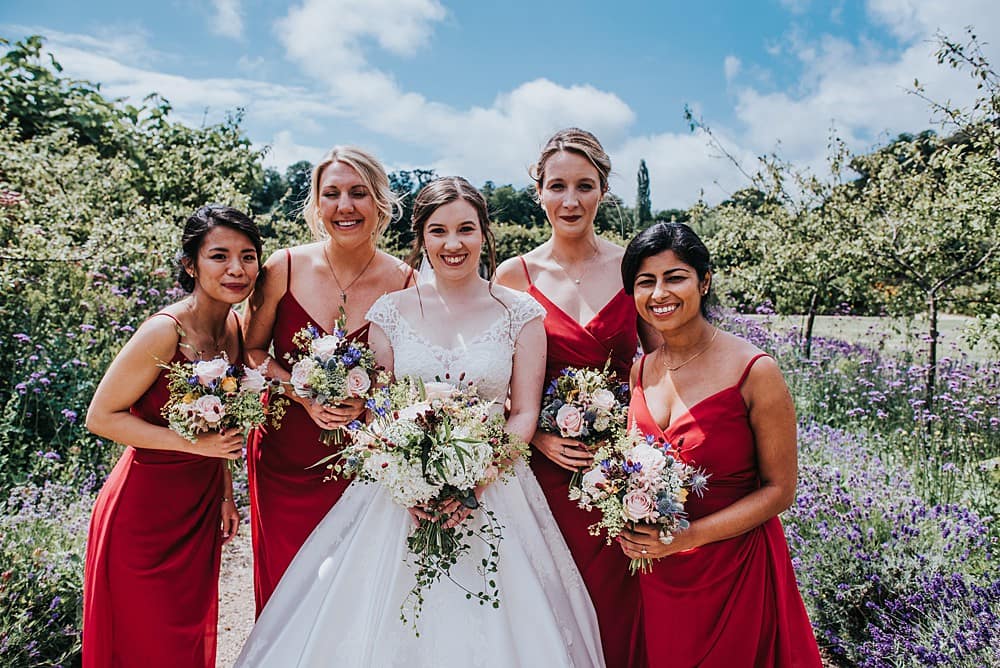 We wanted a bright and colourful palette to reflect the summer wedding and our personalities. I always wanted to have burgundy bridesmaids’ dresses, just like my Mum! And this led us to shades of blush pink, accents of deep reds, muted mustard and blues.