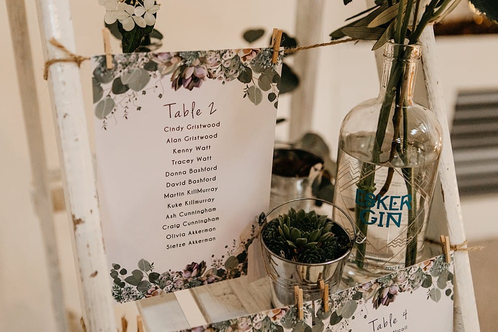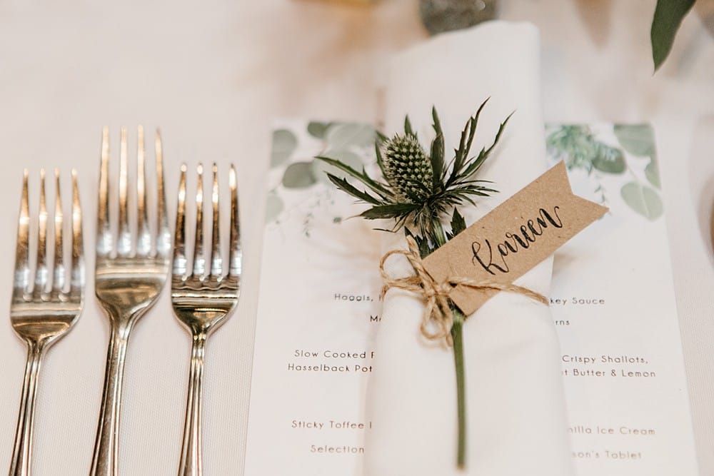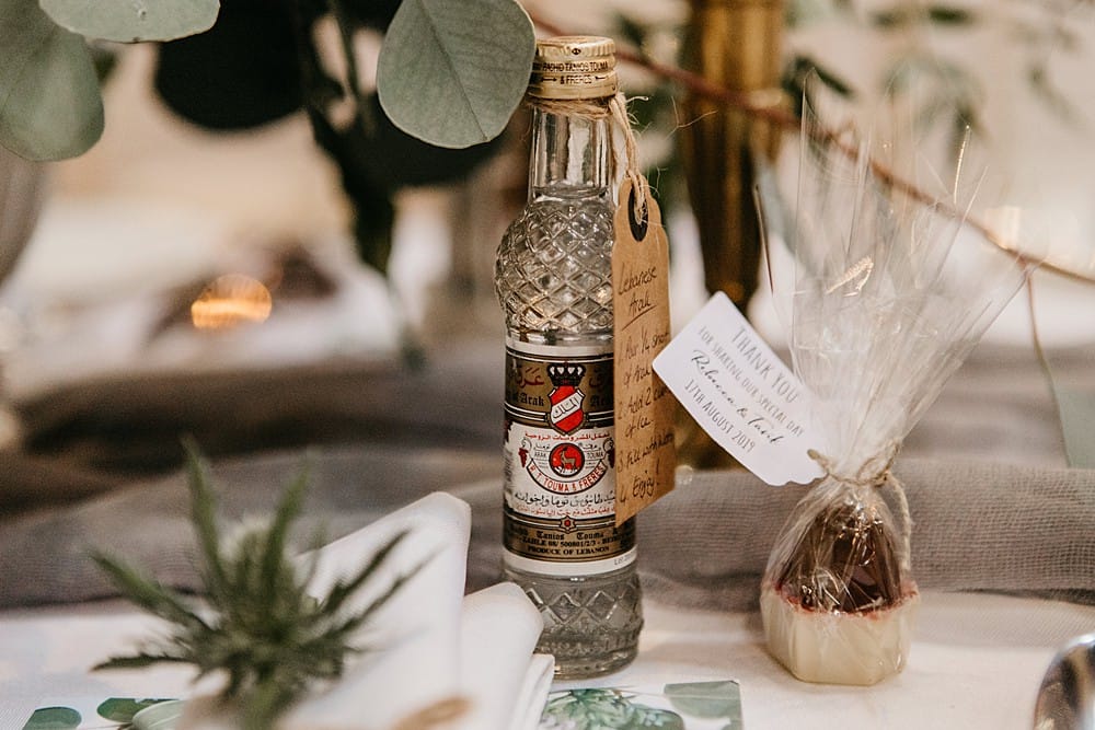 Our caterer was Val Morrison. She was an absolute star. The food was amazing and all guests raved about it for months after. Val also helped with styling the barn – laying out all our individual menus, tying the thistle and olive branches to the napkins (my husband is half Lebanese so we incorporated little touches from Lebanon with the olive branches and Lebanese Arak drink favours for the boys). Girls had succulent plant favours which were sourced and planted by me and my mum!