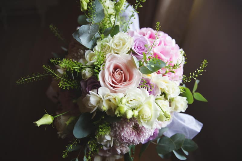Our main colours were pinks and purple, but the pink was a dusky pink and the purple was a lavender fog kind of purple. For the flowers, we mixed in ivory and white flowers to keep things fresh. We had three different types of centrepieces, two pedastalls at the end of the aisle and a long, low floral display on the table where we signed the marrigae certificate. We also had petals scattered down the aisle.