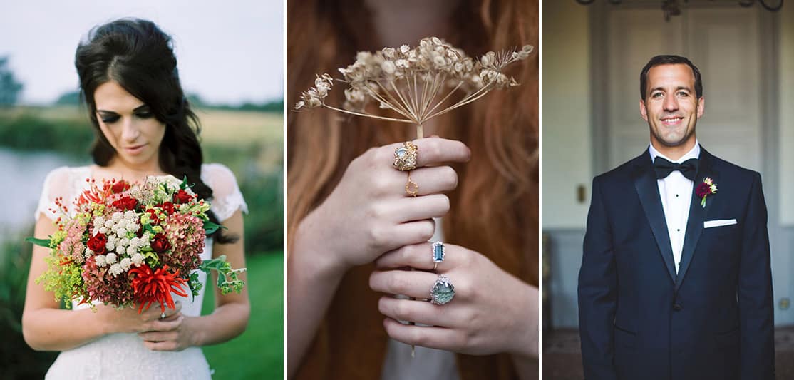 Left: Image by Samantha Ward Fine Art Photography at Sandhole Oak Barn. Middle: Image by Gabriela Silveira Photography for Sarah Brown Jewellery. Right: Image by S6 Photography via Rock My Wedding.