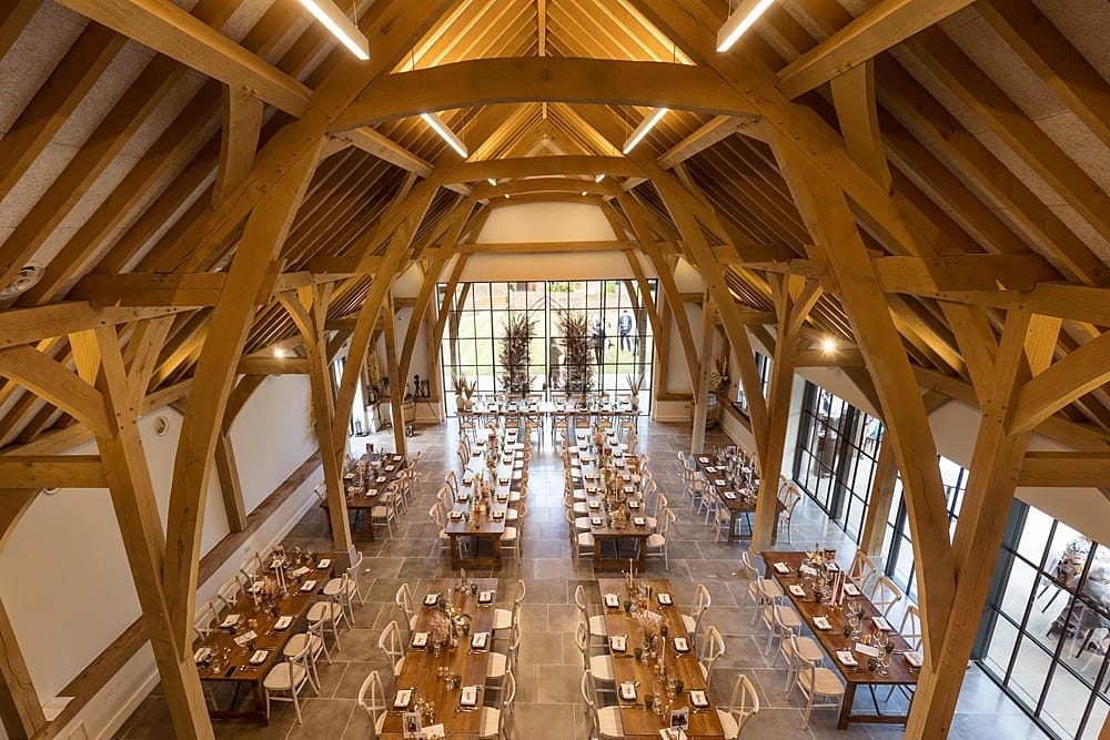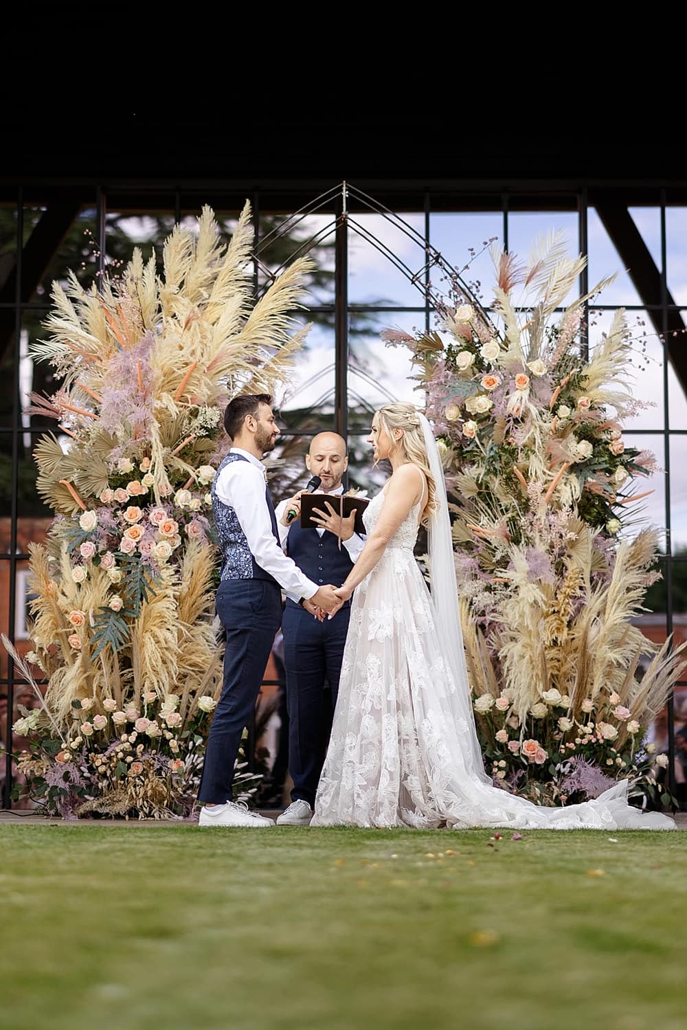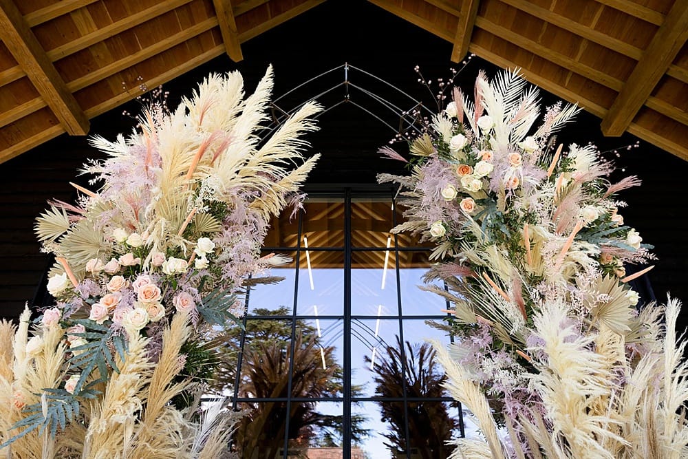 S & L were so confident in this venue and their vision, they booked it based on the architect drawings, and only saw it completed on their wedding day! They styled the space beautifully with a boho-glam theme of pampas grass, colourful dried and fresh florals, long wooden trestle tables and a touch of sparkle.