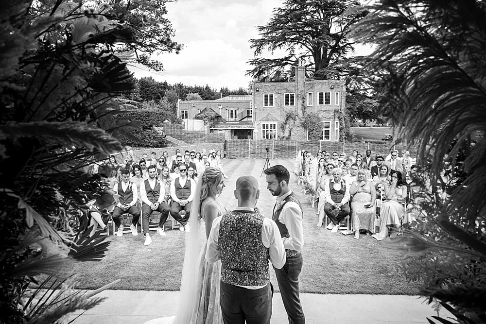 If Simon had it his way the groomsmen probably would have been in multi coloured suits. But we went for navy waistcoats with a funky white tiki vibe on the back, navy trousers both from Moss Bros, Hugo Boss white grandad collar shirt, white Jack & Jones trainers, and a pampas buttonhole.