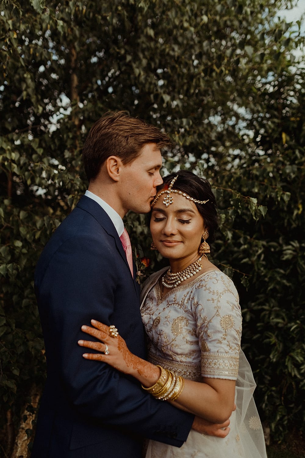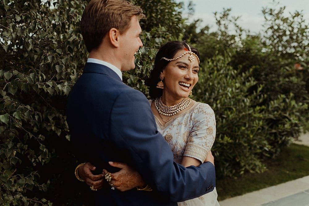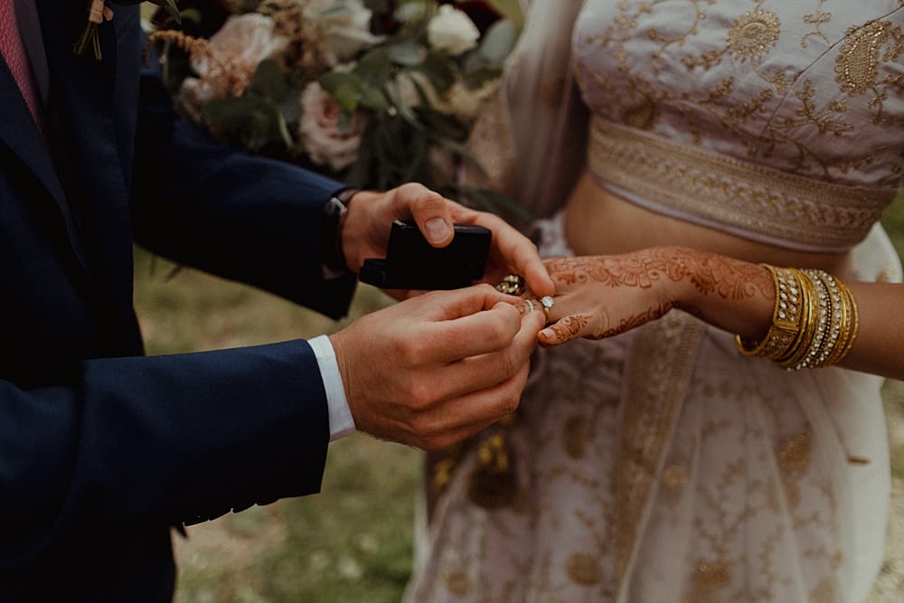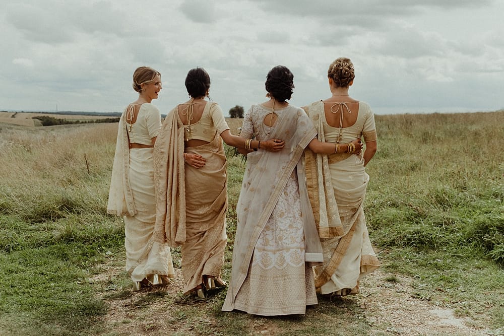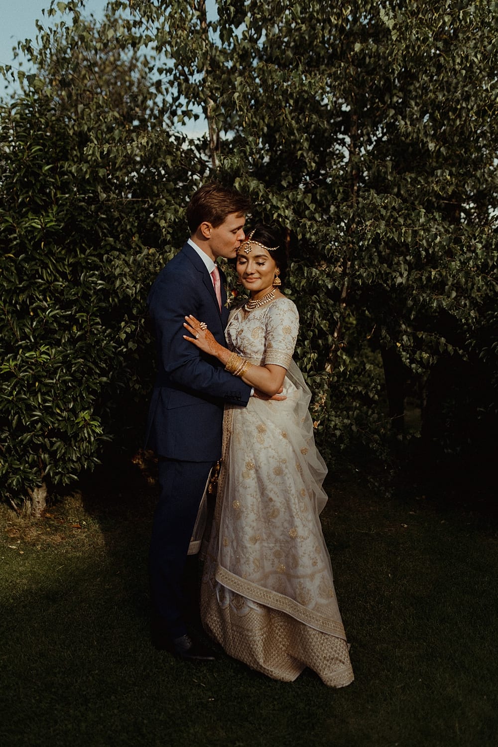 Alongside my parents, Danny and I bravely travelled to New Delhi’s colourful maze of shopping districts and bazaars to buy our traditional Indian wedding attire. I envisioned soft, natural pastel colours for the wedding party, accented with gold embroidery. My bridal lengha was blush rose with gold accents adorned by a gold layered necklace, bangles, jhumka earrings and a tikka headpiece. Katie-Jane Whitlock elegantly styled a loose hair updo that held throughout the long day, and Katy Pheiffer made me feel naturally beautiful and flawless with my makeup. The bridesmaids’ saris were various shades of gold and cream. Danny wore a white and gold sherwani suit for the wedding ceremony and then changed to a navy lounge suit from Kent & Haste for the reception. Beyond the wedding party, the fusion of Indian and British attire of our guests made for a colourful, vibrant and inclusive celebration.