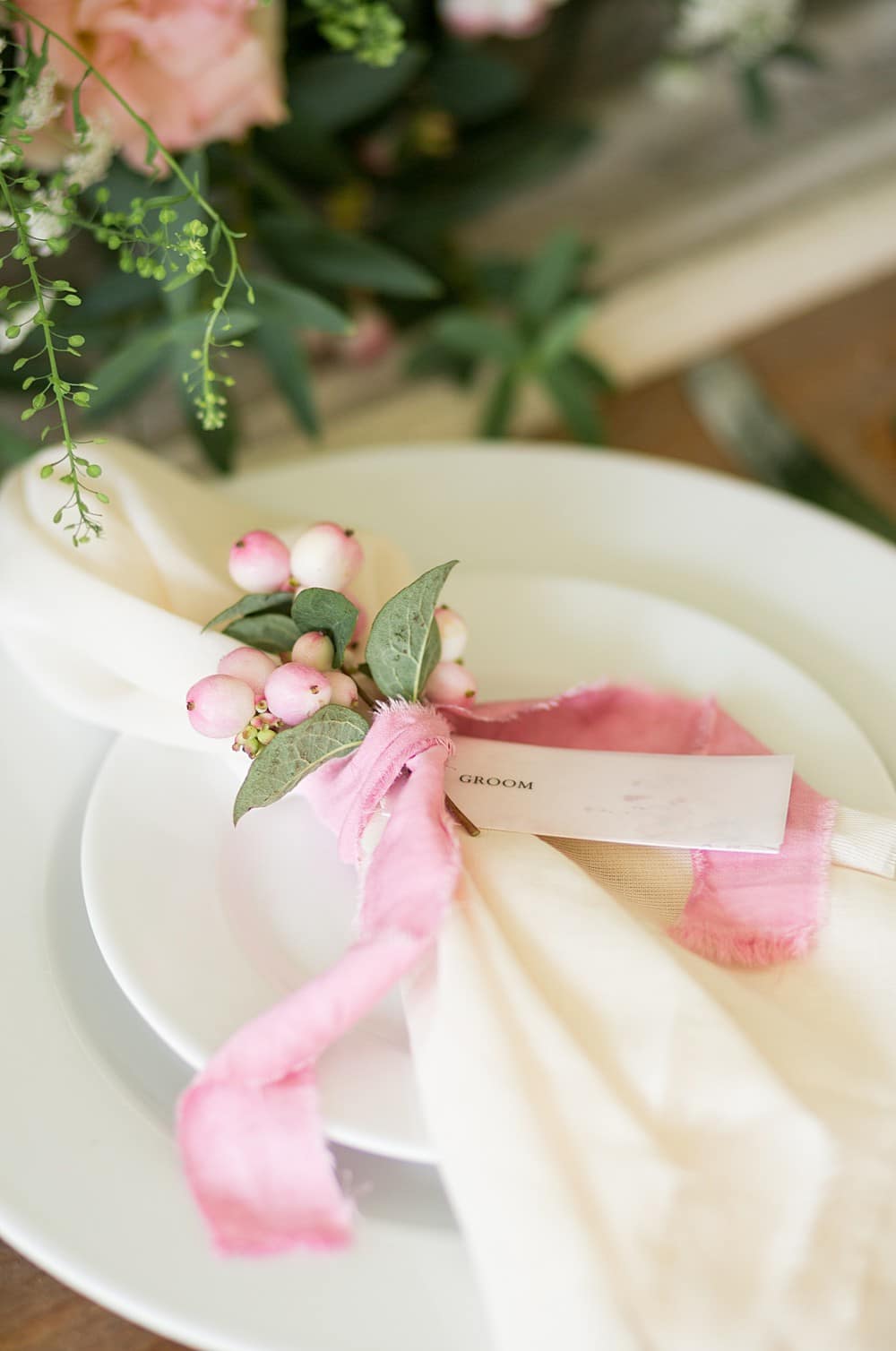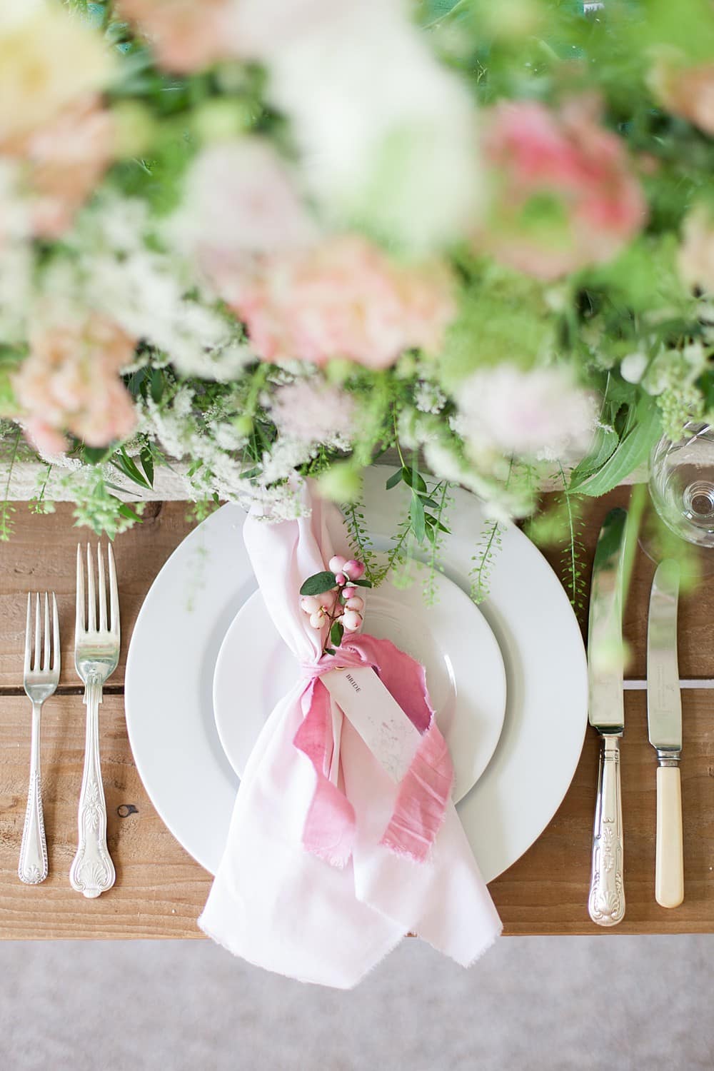 Hand-dyed blush cotton napkins and ribbons complete each setting along with a softly illustrated floral place card designed by Jacquie (White Olive Design Studio) to complement the floral design. Jacquie also created a bespoke, gold foiled and vellum stationery suite incorporating floral details and illustration of the venue, adding a personal touch.