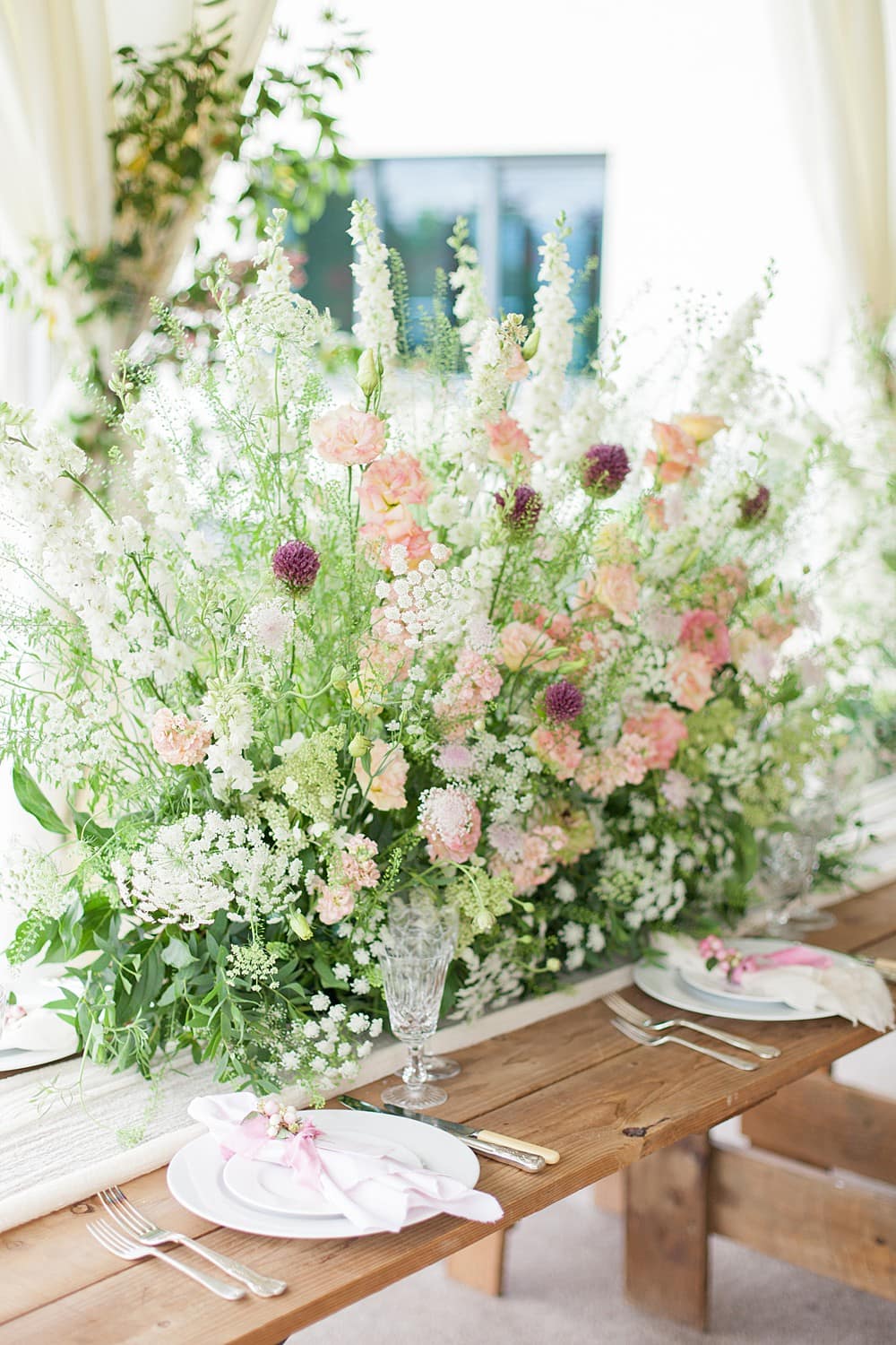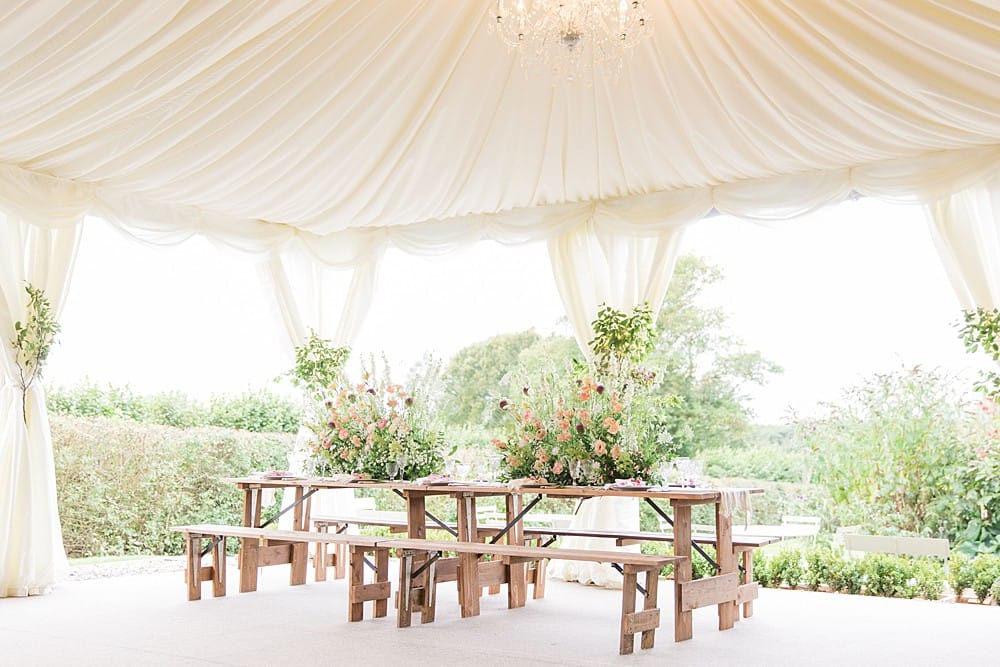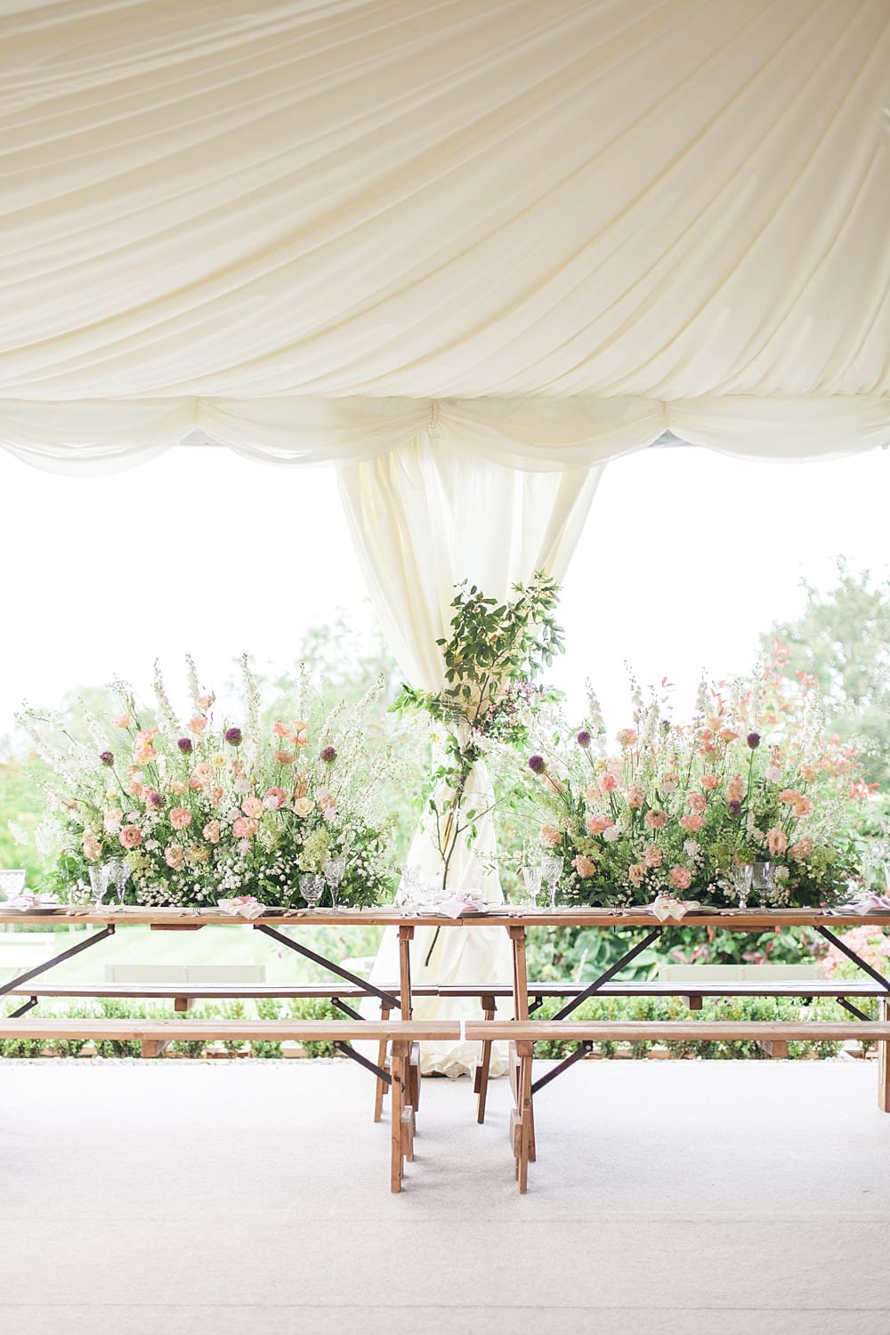 Delicate meadow-like florals were also used on the tablescape, bringing the outdoors into the light-filled marquee where rustic tables and benches add to the informal atmosphere.