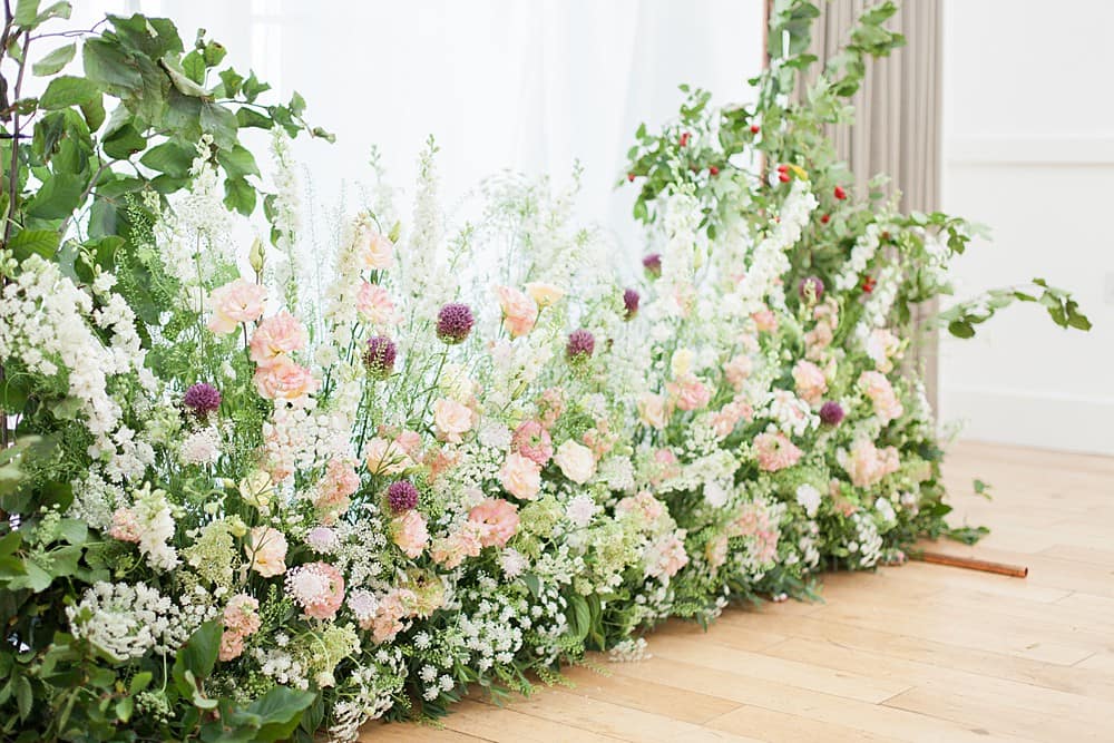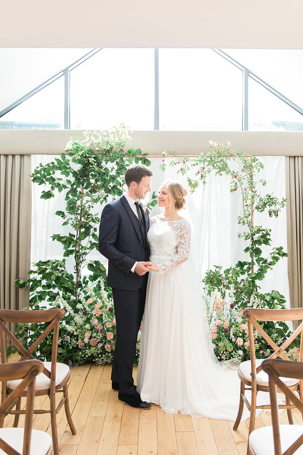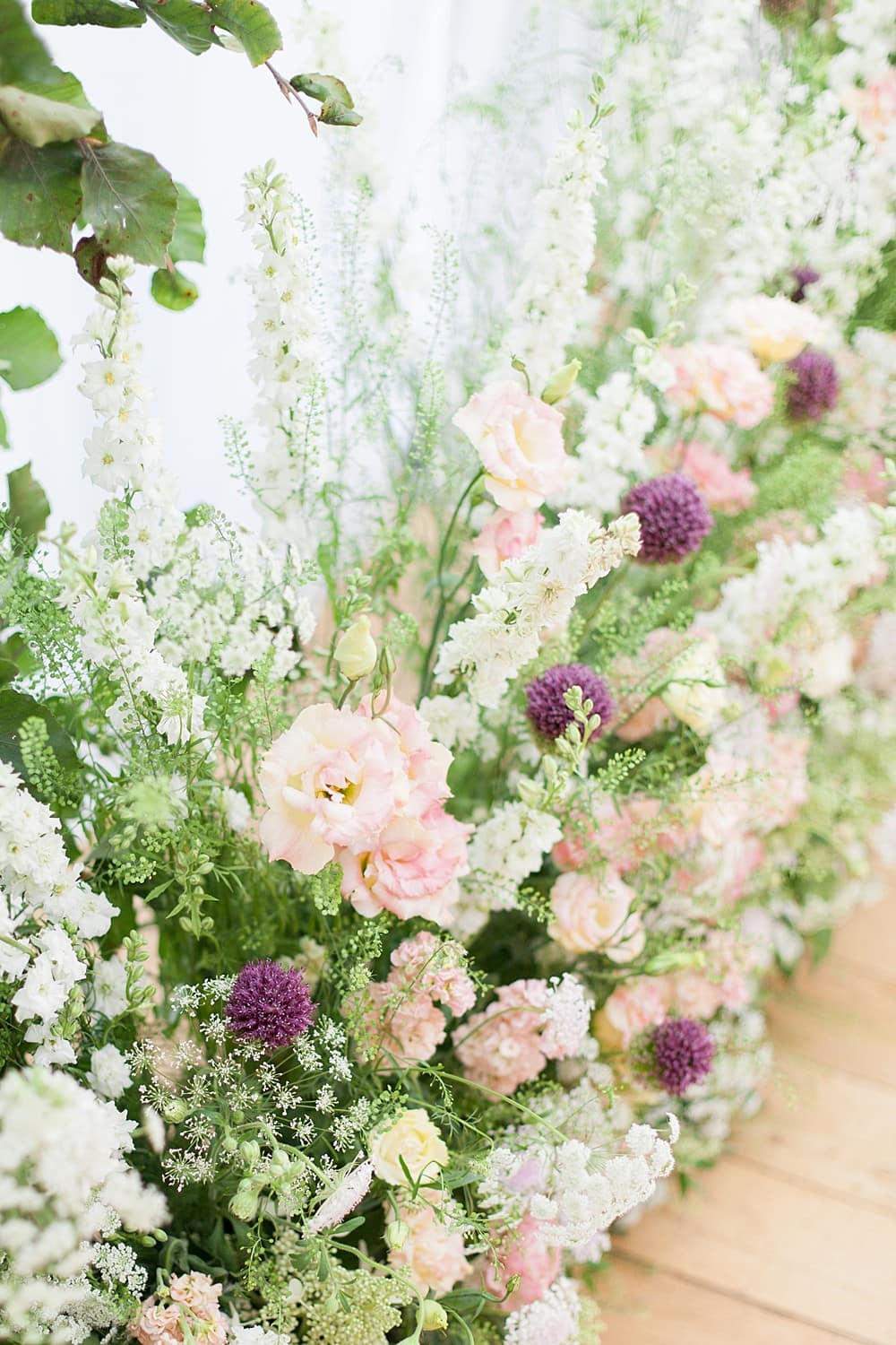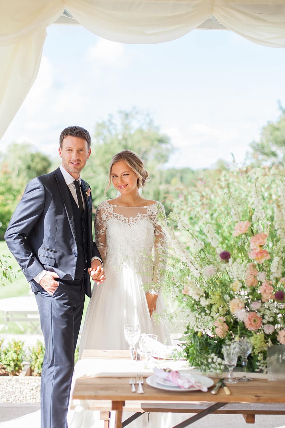 Taking their cue from 2020 floral trends, stylist Louise (The Brand Studio) and florist Amy (Bo Boutique) centred their design on statement floral arrangements. They created a stunning floral archway for the ceremony pavilion using branches of birch and trailing amaranth, bundles of rosehip and pink snowberries, with dahlia and roses adding colour and wispy grasses providing texture to reflect the wild informality of the English countryside.