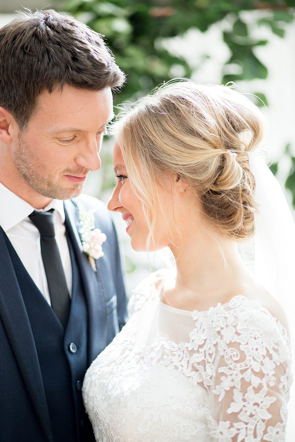 The bride wears Madeleine by StelFox Bride (provided by Hagley Bridal Studio), barely there makeup and an elegant swept-up hairstyle created by our hair & makeup artist Ruth (Makeup by Ruth), In keeping with the relaxed vibe, while the groom looks dapper in his tux (provided by Harveys Formal Hire) and snowberry buttonhole.
