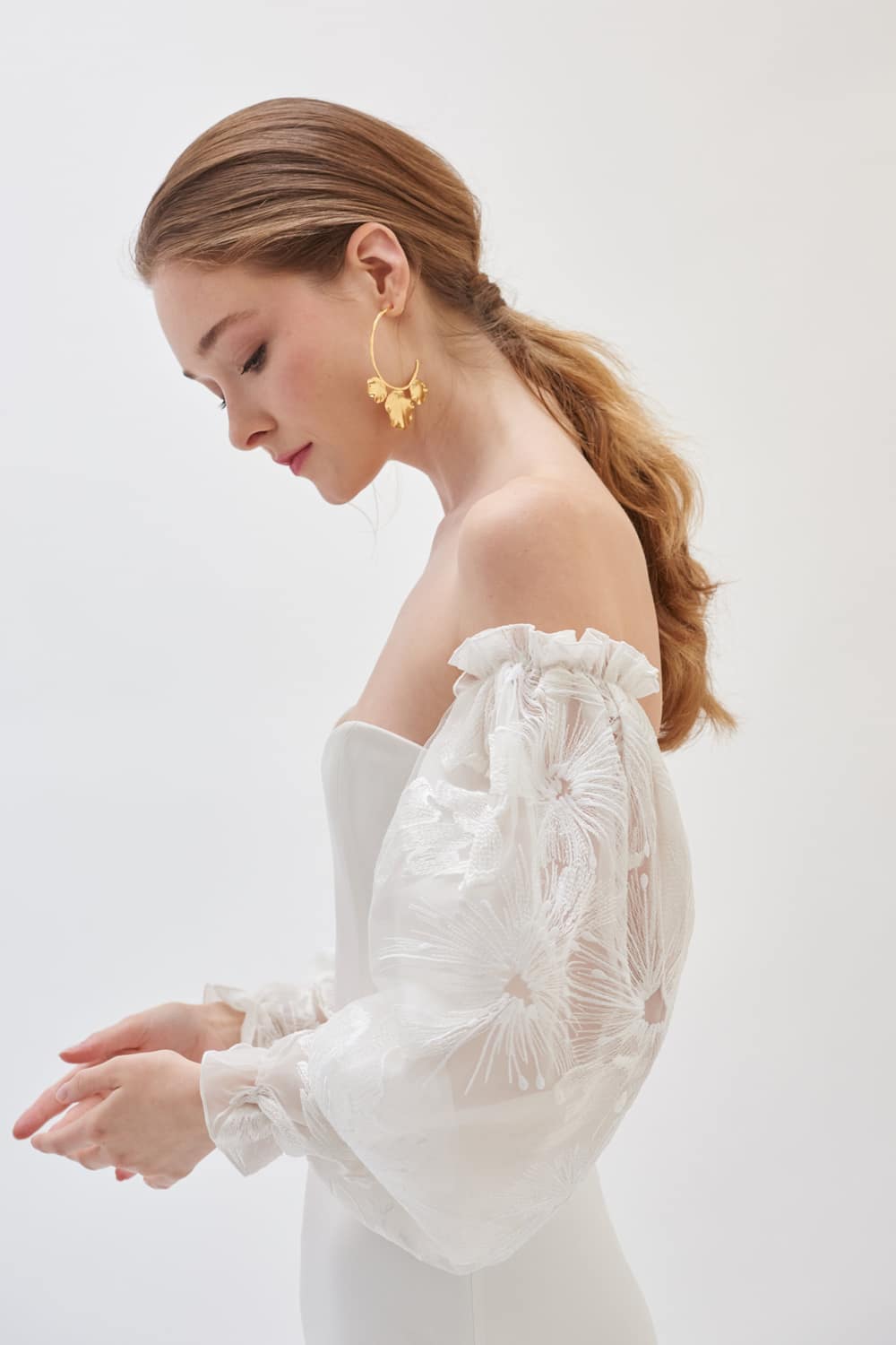 Oh yes they are back, not quite how we remember them circa Princess Diana. A perfect example of this is the Reine dress by Alexandra Grecco. Featuring exaggerated bishop sleeves to create drama. The sleeves are positioned just below the neckline just adding that modern day twist.