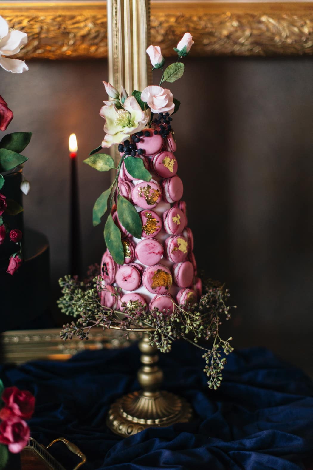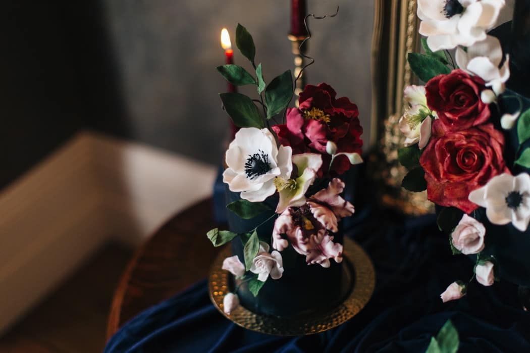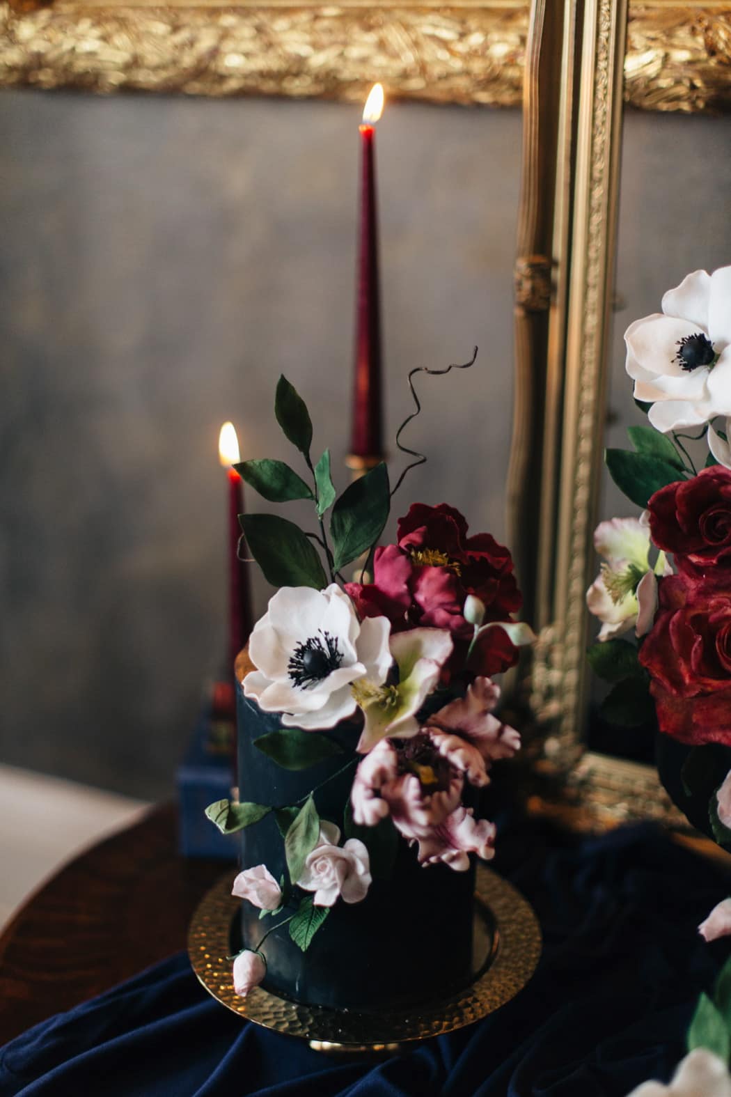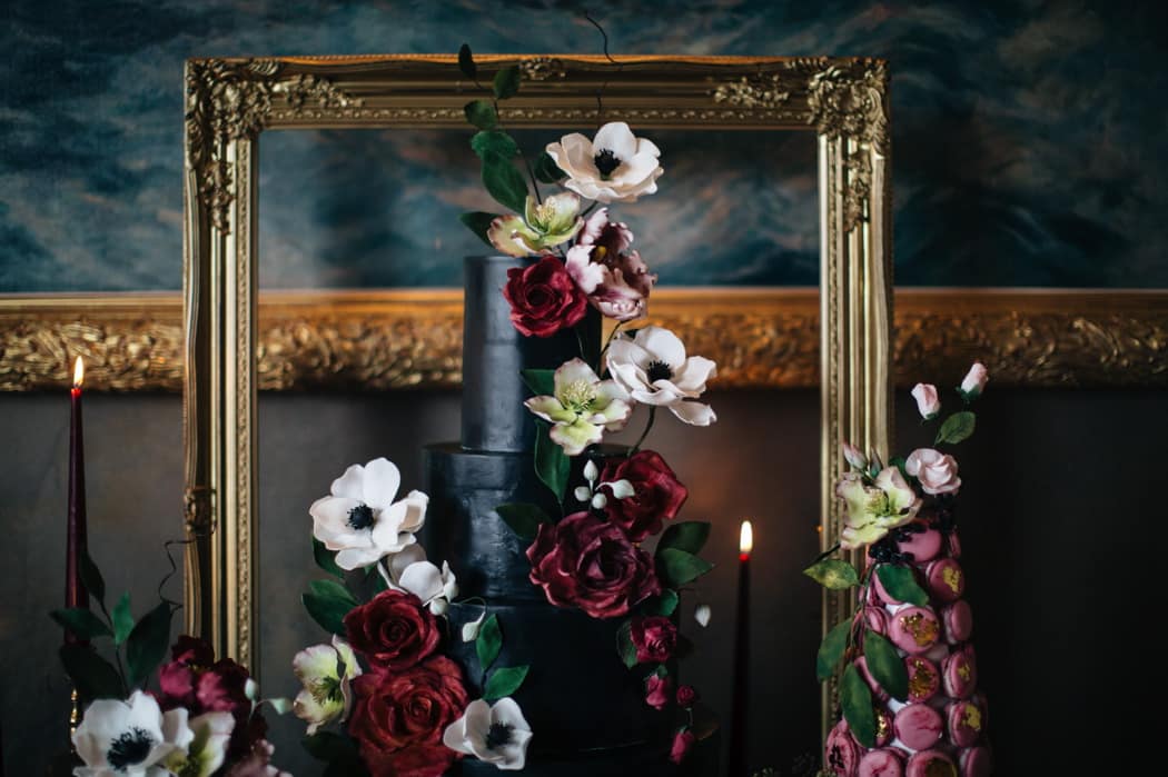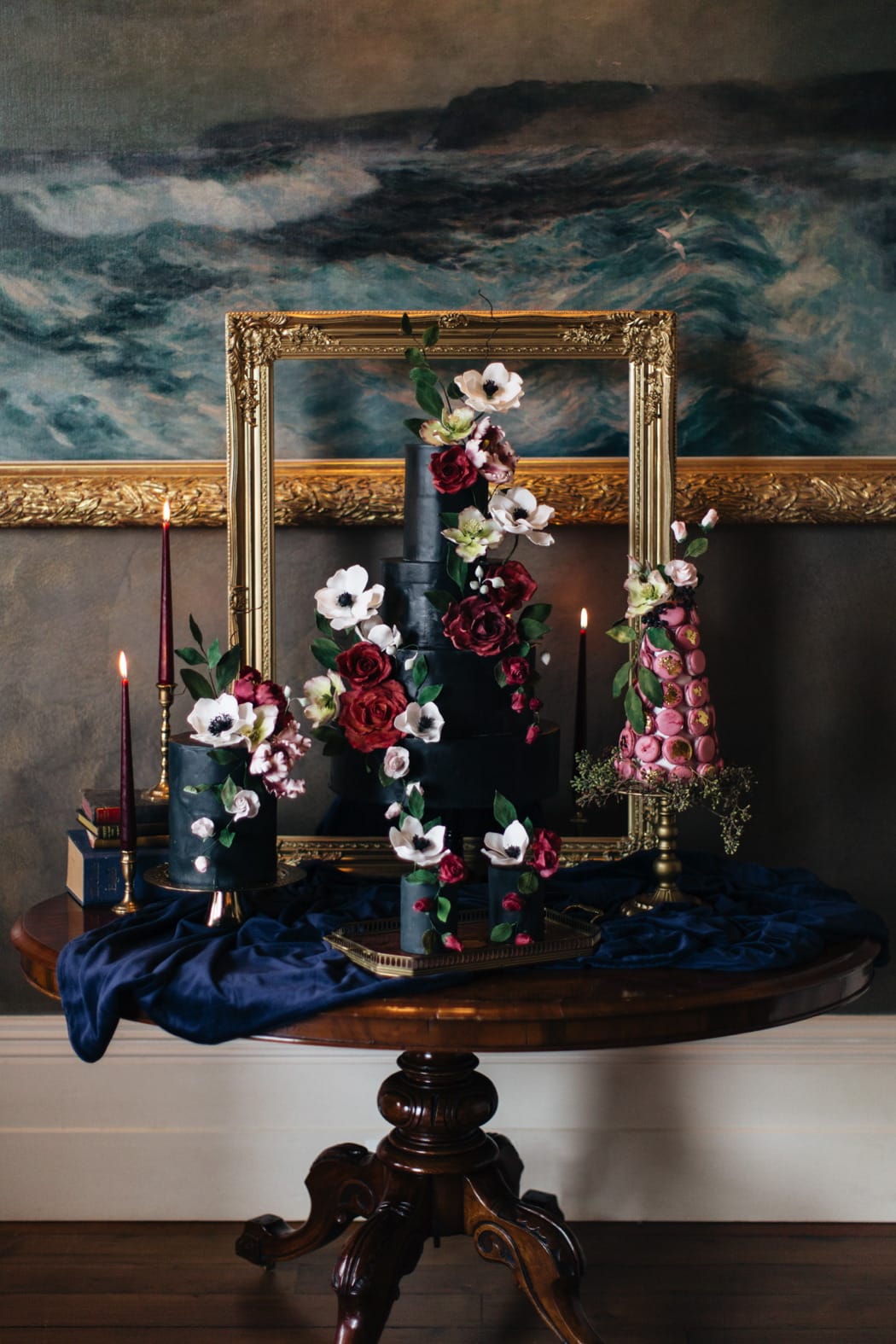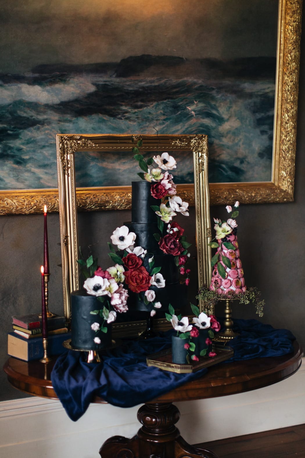 Edible Essence created a stunning cake display with a 3-tiered main cake and displays of smaller cakes in a dark inky blue with burgundy and ivory flowers.