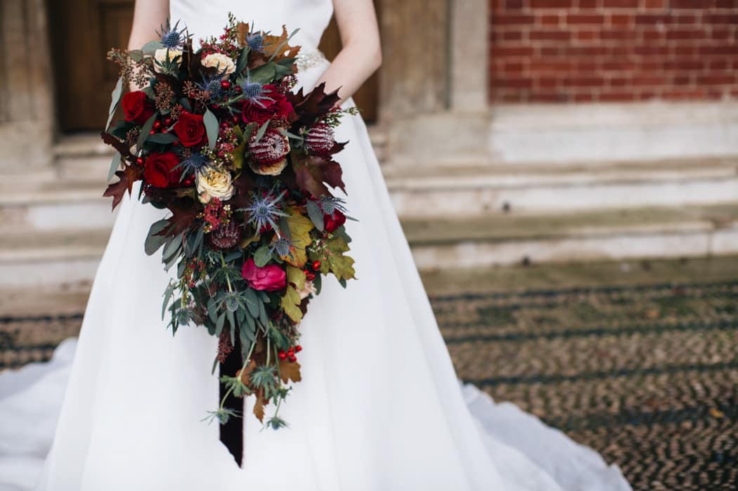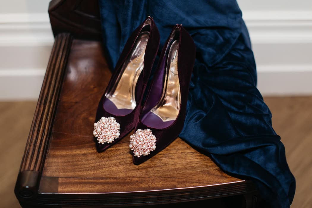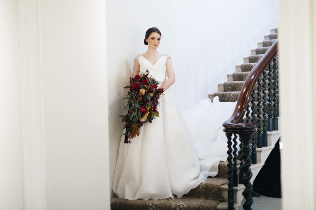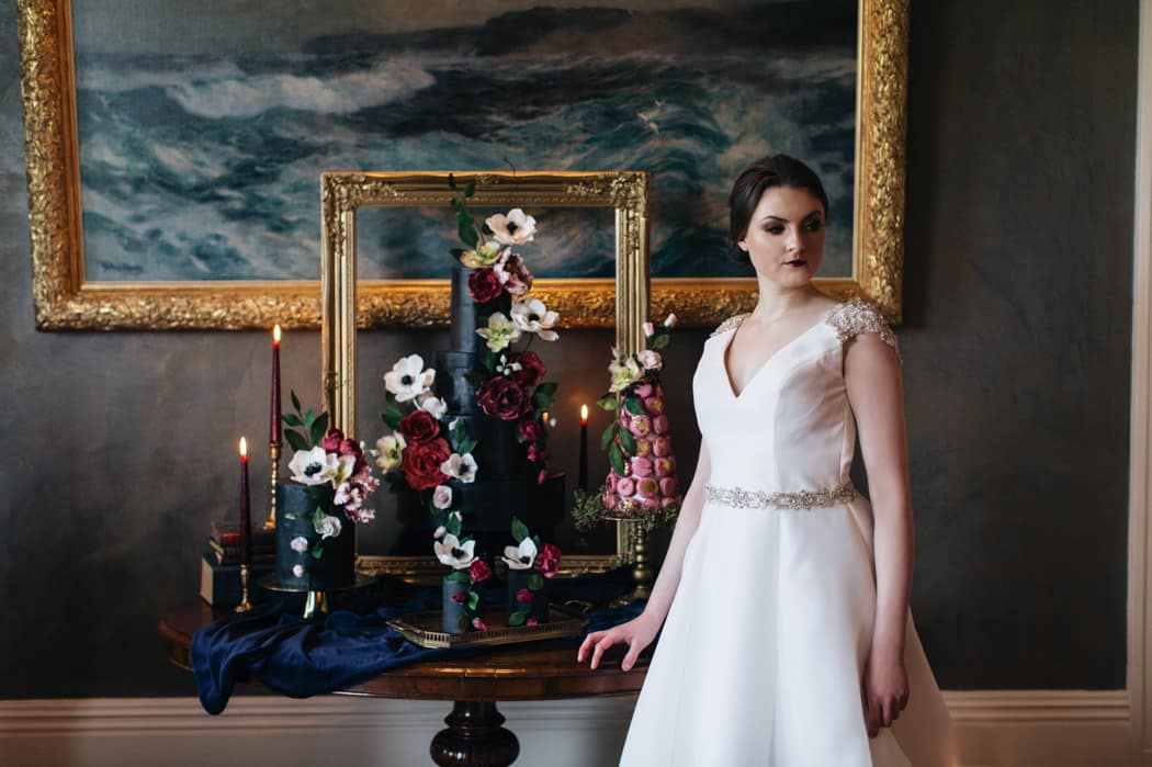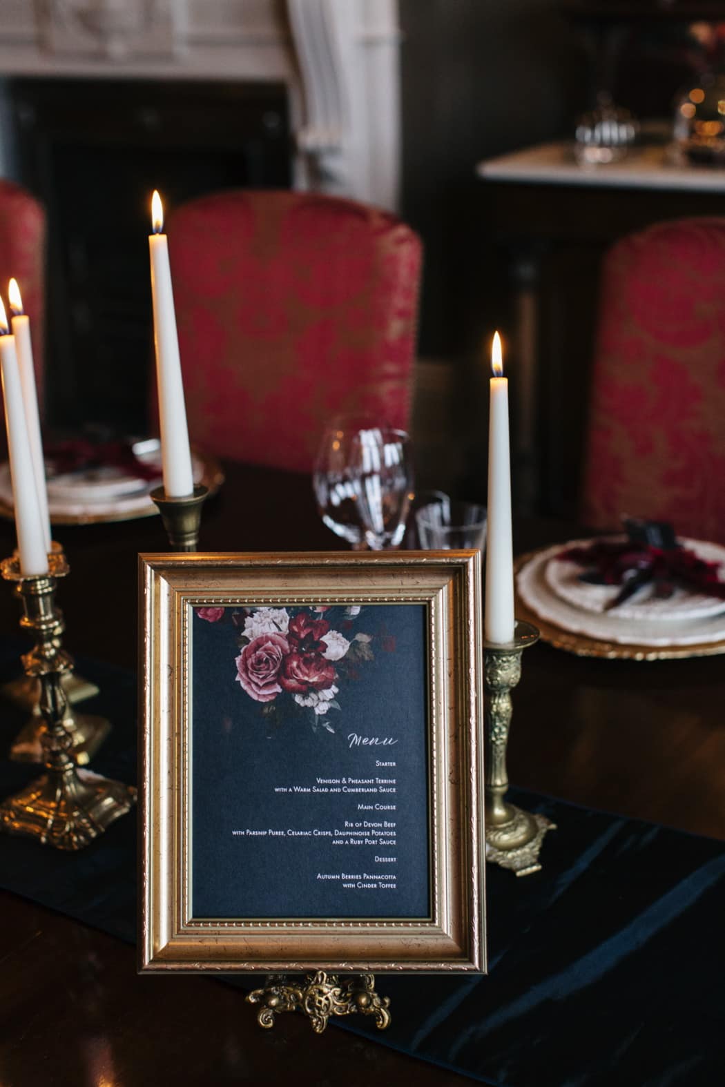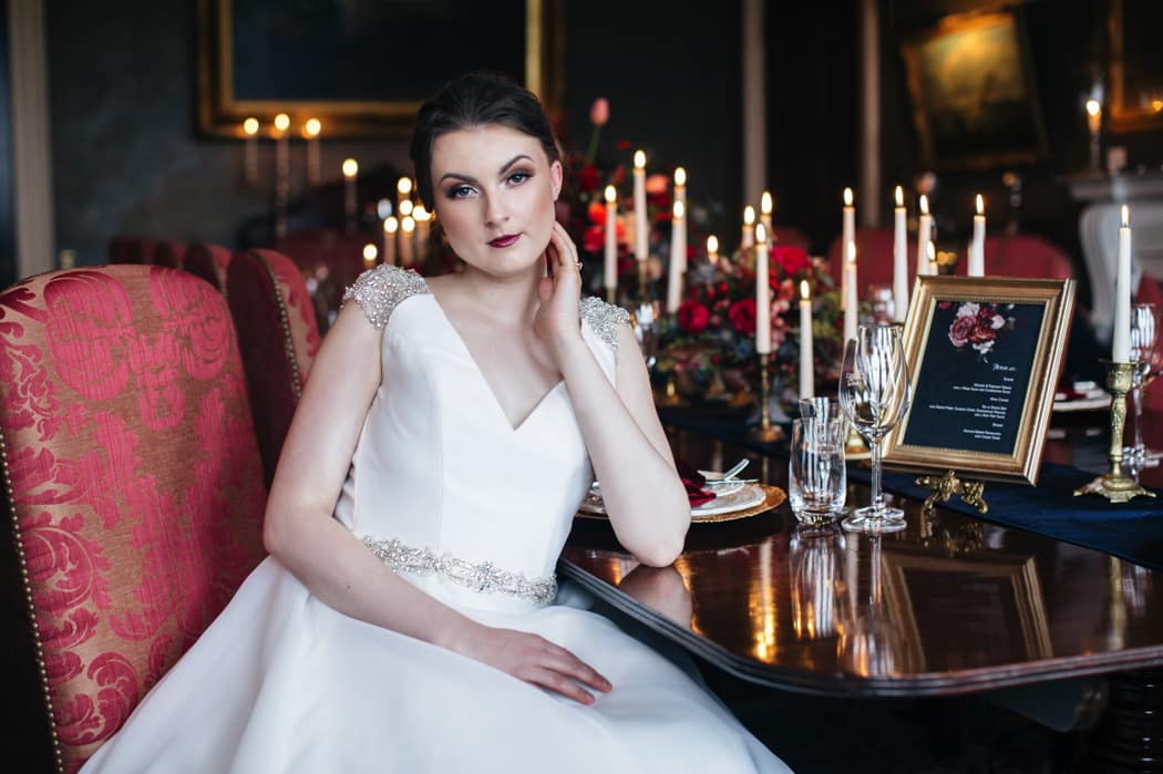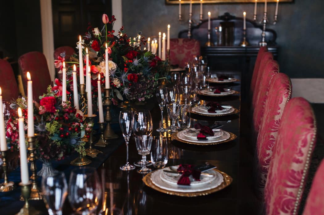 The overall theme was a dark, elegant and intimate winter wedding. The concept was put forward and the stylists main inspiration had been to take the winter style and décor of the house and translate that into a ‘Dutch Old Masters Painting’ feel. Burgundy, navy and metallics made up the gorgeous wintry palette.