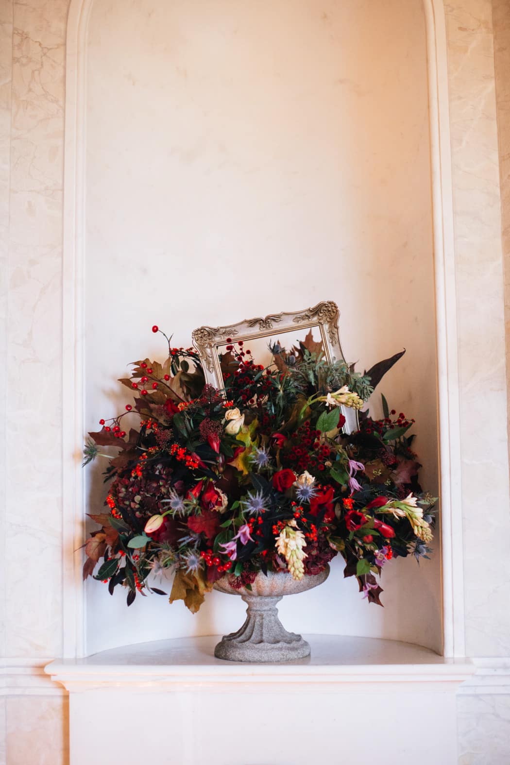 Amanda Randell’s choice of flowers was influenced by the rich palette, with deep reds across the hue spectrum being predominant with accents of cool blue. Dutch still life paintings portray flowers from different seasons filled with tactile textures, so the flowers were chosen with care and included: Roses, Tuberoses, Tulips, Banksia, Astilbe, Euphorbia and Hydrangea to name a few. The containers continued the look taken from the Baroque design era (c1600 – c1700 AD) which were heavy urns in stone and metals, with the flowers taking on a simple asymmetric form loosely based on the English painter William Hogarth’s love of the S shape. The effect was rich and promising with a more current natural garden styling giving a more informal quality within the sumptuous setting.