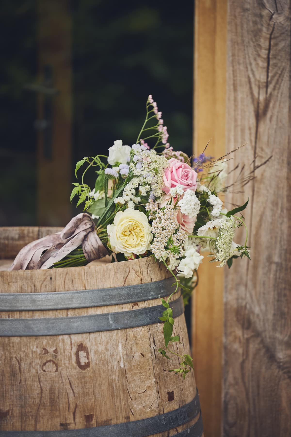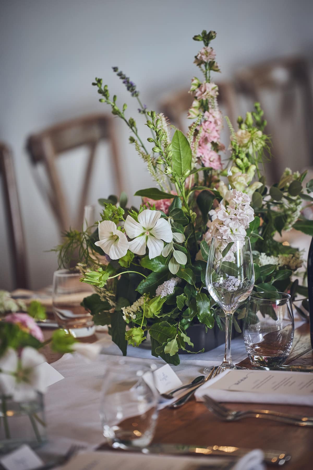 Our colour theme was based around the dusty blue and navy outfits of the bridesmaids and groomsmen, which then fed into our choice of flowers and other things like the wedding stationery. We took a relatively laid-back approach to style, keeping with the day’s relaxed vibe, and let the venue and its setting do the talking. Our florist, Sophie Millington, ran with this styling perfectly, complementing the space and our outfits with beautiful natural flowers and colours.
