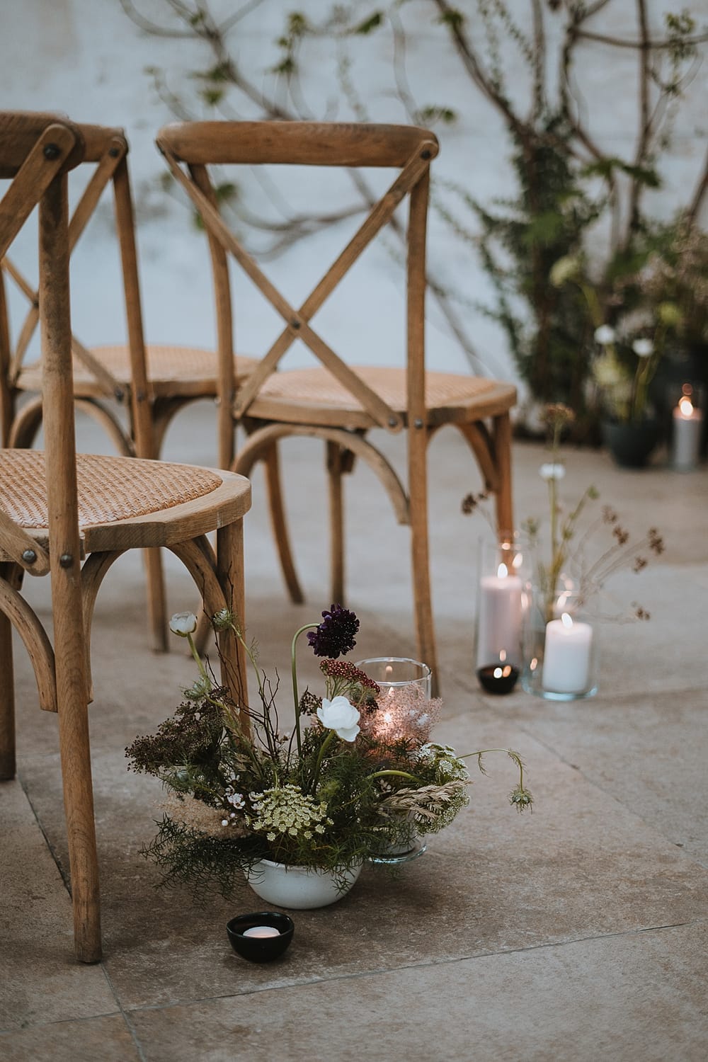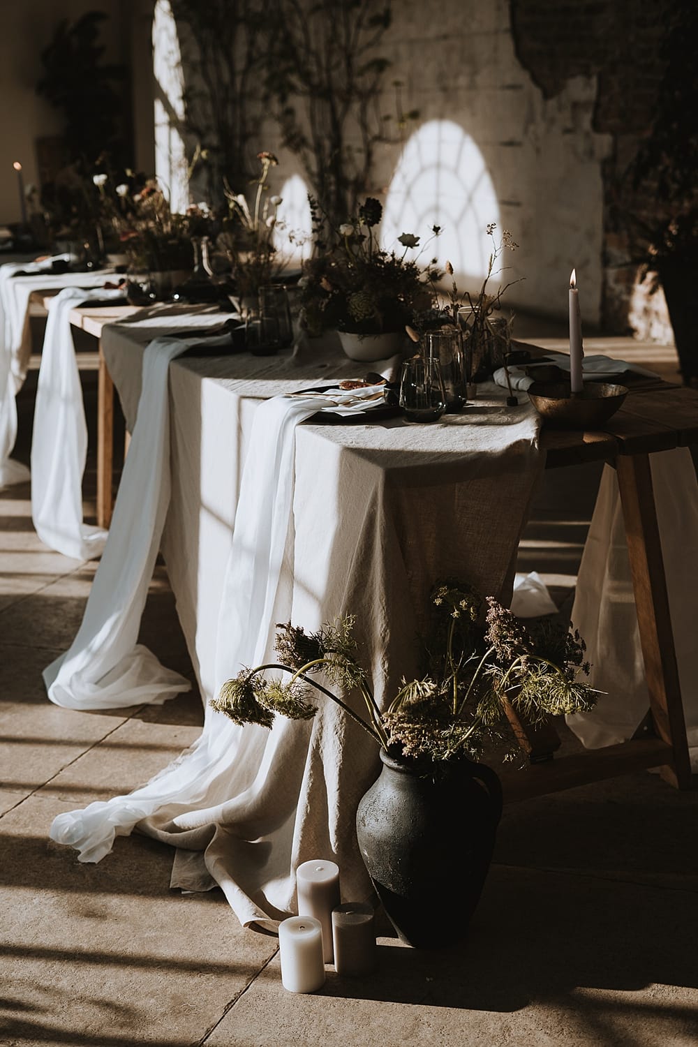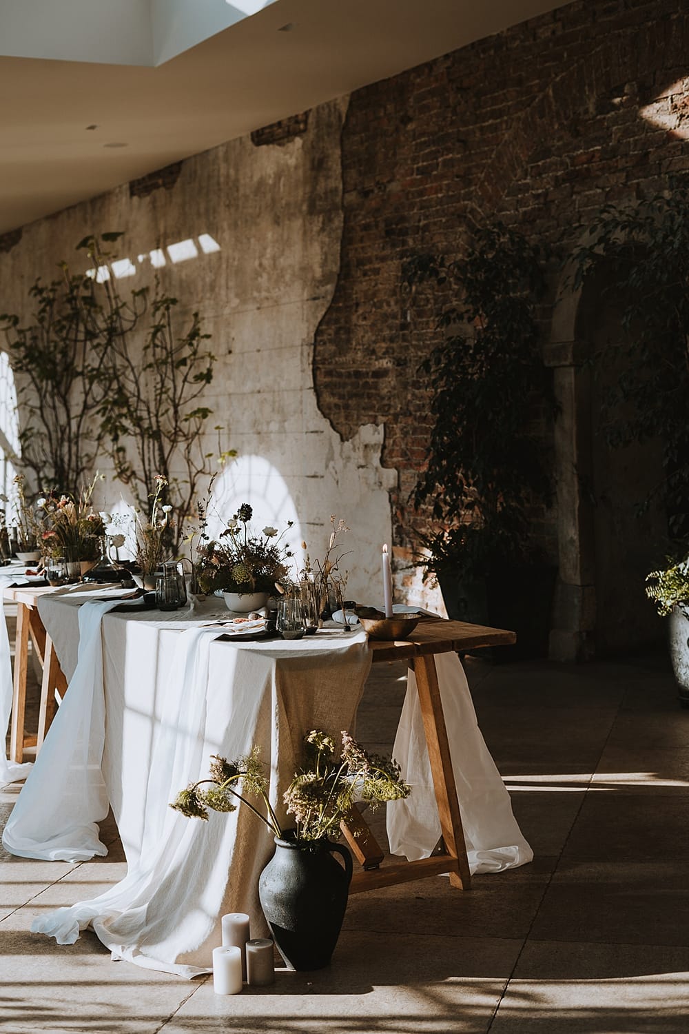 We worked with the recently published Frances & Rose who specialises in growing her own flowers and working as eco-consciously as possible. Seasonal fresh flowers were used along with stems of dried florals are spread intermittently across the table to add colour, depth and texture and provide cohesion across the venue.