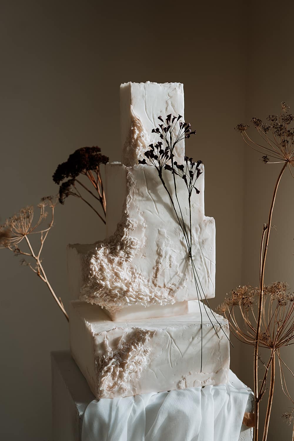 The natural fibres and textures in the table and cake design complement those found within the architecture of the The Fig House. Long lengths of billowing fabric drape over the tables to create a soft romantic feel. Considered placement of dark stone and glassware contrasts against the white fabric creating a modern tablescape design. Lilac tapered candles and figs bring in colour to an otherwise monochrome palette.