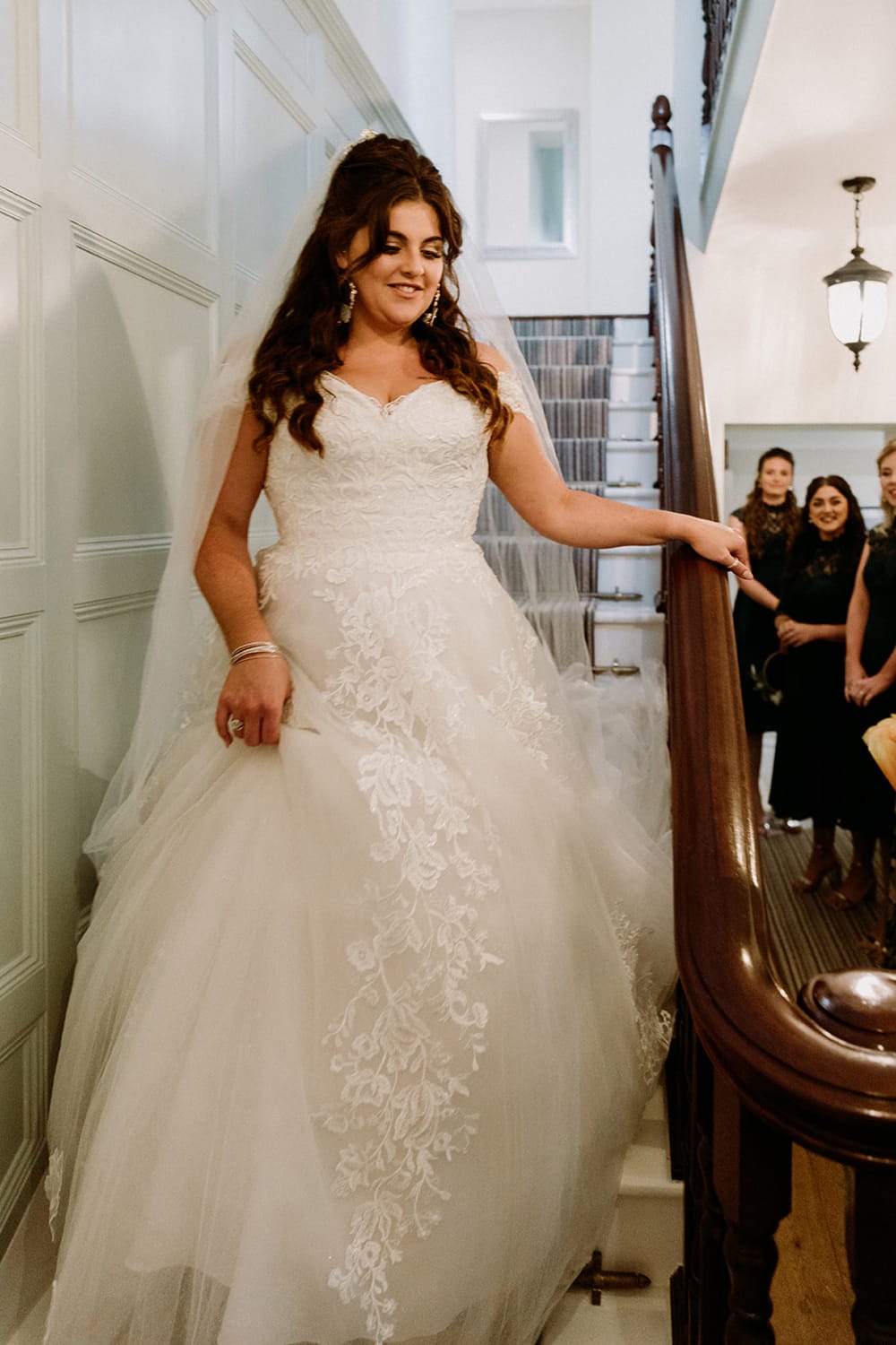 I didn’t love the wedding dress shopping experience, if I’m completely honest. I had a vision; I’d seen ones I had liked, but nothing caught my eye. A bridal shop in Southampton talked me through how to create my own look by altering a ‘Princess-style’ dress. I told them I wanted drop shoulders, lace and fewer layers in the skirt, and it wasn’t a problem – I’ve always had it in my head that I would buy two dresses and smash them together to create something unique for me, and I guess that happened.