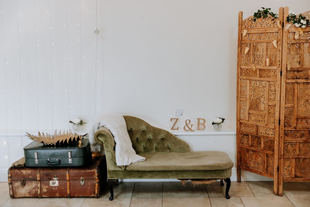 Decorating the venue was a DIY endeavour, with thrifted items, wooden screens, vintage barware, and peacock chairs all hired from Botanical Vintage. I very much wanted this to be my vision, and my husband-to-be told me to ‘crack on’, so in true Zoe-style, I did. I thrifted for years, made cheesecloth napkins, and bought second-hand gold cutlery, charger plates and anything else needed! Despite the rain, the added elements created a wonderful atmosphere. Flowers and foliage from Summer Lilly’s were exquisite; the flowers were a mixture of white flowers, thistles that represented my grandparents and heaps of foliage for a natural feel. We also had the ladies make a small rustic bouquet from dried flowers and a matching flower crown for our ‘pre-wedding’ at the registry office the day before. Nothing was too much for them.