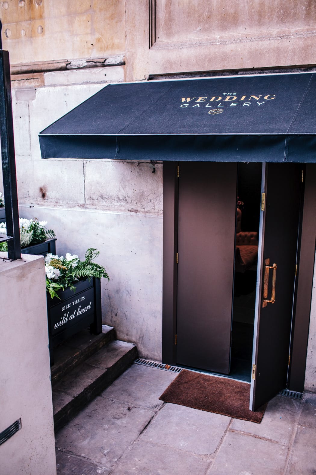 The entrance is at the side of the building and is marked by a striking foliage archway leading you down a few steps to a shiny black door. A black canopy emblazoned with the gorgeous Wedding Gallery logo confirms you’re in the right place.