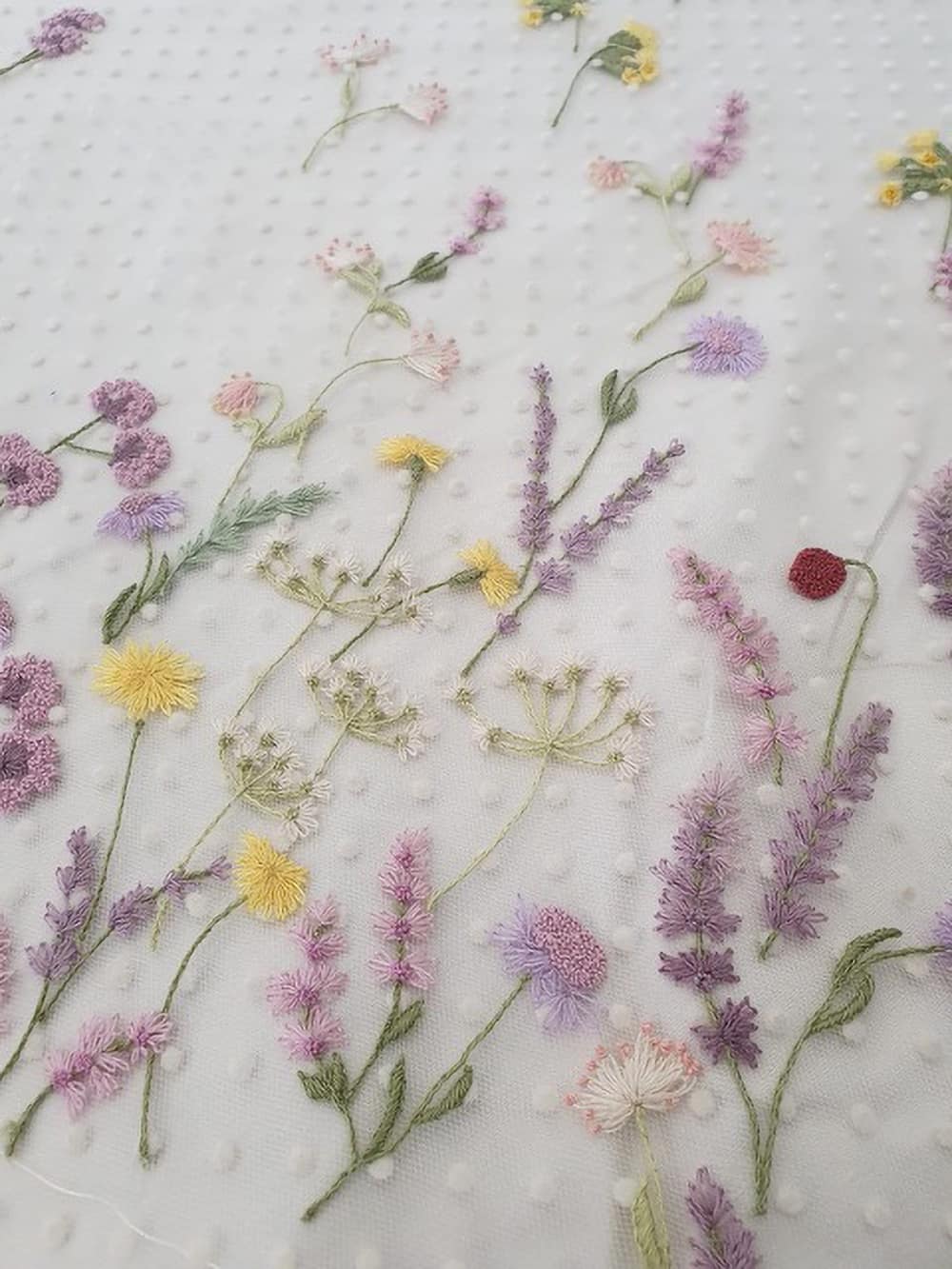 Lots of my brides are asking for bespoke embroidered tulle overlays. These are additional pieces that can sit on top of a simple, ivory, bias-cut sheath dress or a corseted clean base satin dress. For a wedding at Tythe this might feature hand embroidered wildflowers and leaves that reflect the surroundings. It might be something like the Mexican daisy Erigeron which grows wild, almost like a weed, or perhaps lavender. You might be walking through fields of poppies, so have those embroidered up the side of your dress, or cornflowers, dandelions, cowslips, all are elements that could chime with your setting. Later you can peel the tulle overlay off and have a dazzling sparkling overlay layer for your evening barn dance. A low back is also beautiful.