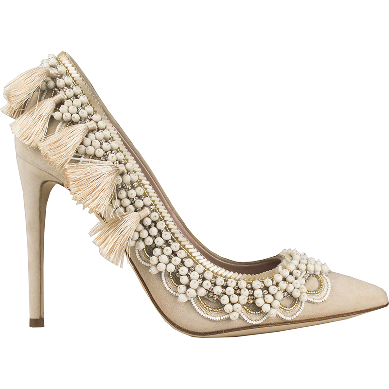 Celebrating the beauty of English summer time, Meadow Dreaming is the epitome of classic Emmy London’s contemporary yet timeless style. Key pieces feature signature elaborate trims using delicate stitching, flat sequins and ornate glass beadwork alongside gold embroidery upon sumptuous blush suede. The collection sees the introduction of new seasonal tones for day-to-evening looks paired with show-stealing statement embellishment.