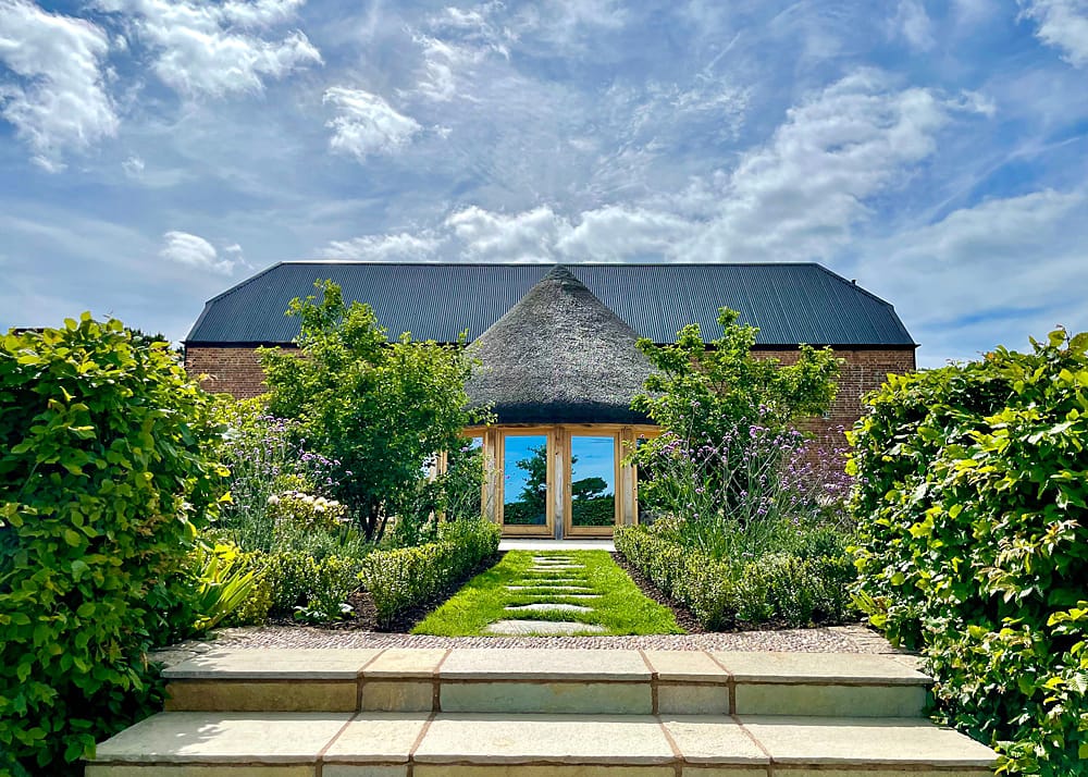 After nearly three years of building works, the thatched, 18th Century Round House with massive oak beams and an octagonal softwood roof structure has been completely rebuilt, providing a beautiful space for wedding ceremonies. Sitting on the landscaped terrace, overlooking the vines, and the rolling Devon hills makes it an idyllic spot for Elopement, Micro Weddings and larger celebrations in the Barn. The beautifully restored traditional barn is the perfect barn wedding venue for up to 60 day-guests and up to 100 guests for your evening celebrations. It skilfully combines tradition and modern architectural design to create a unique synthesis of rustic charm and stylish elegance. Stunning features such as the open-vaulted oak beam roof alongside modern design and in-house bar for comfort and convenience provides a unique space . Complete with a private landscaped terrace offering views over the Vineyard to the sea beyond, parking for up to 25 cars and wheelchair-friendly, the Barn provides an impressive and versatile space for unforgettable wedding celebrations.