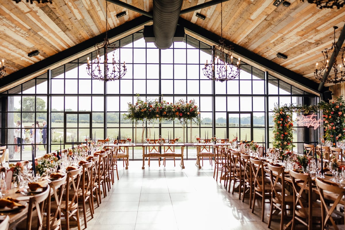 Grange Barn is all about laid-back luxury, epic countryside views, and exclusive three-day hire. This family-run gem in Cheshire hosts just one wedding per week, giving couples ample time to enjoy the rustic charm and relaxed vibe. With vast windows and doors framing those unbeatable views, plus a south-facing decking area perfect for alfresco drinks, it’s a dream for outdoor-loving duos. Inside, with the inclusion of a newly renovated on-site bridal suite, a six-meter wooden bar, and quirky lighting that steals the show, you’ve got yourself one seriously cool barn venue.