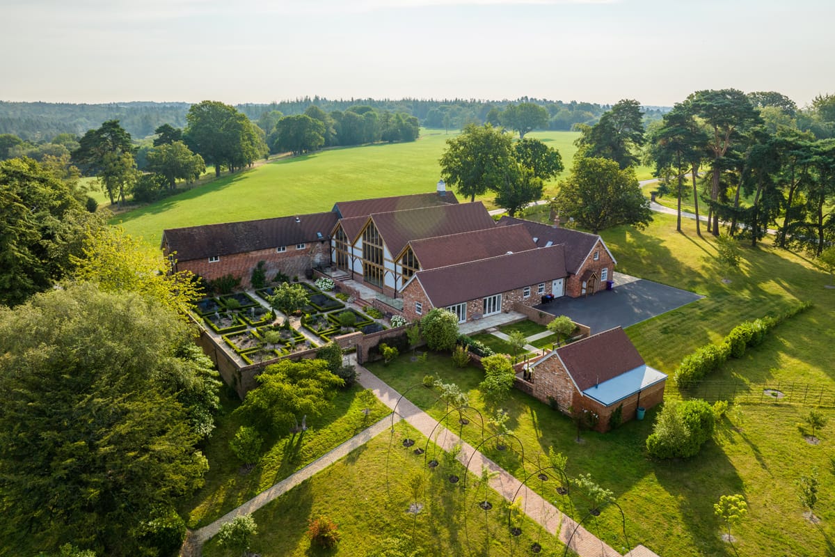 Stylish, sleek, and seriously scenic, The Barn at Botley Hill brings a slice of rustic luxury to the Surrey countryside. This purpose-built beauty is crafted from traditional black timber, with reclaimed wood interiors, exposed steel beams, and those floor-to-ceiling windows (a total showstopper) framing epic Surrey Hills views and jaw-dropping sunsets. Need a place to crash post-party? Their three luxury Shepherd’s Huts—complete with double beds, en-suites, and log burners—are ideal for a cosy countryside stay. Bonus points for those Soho House vibes throughout, too.