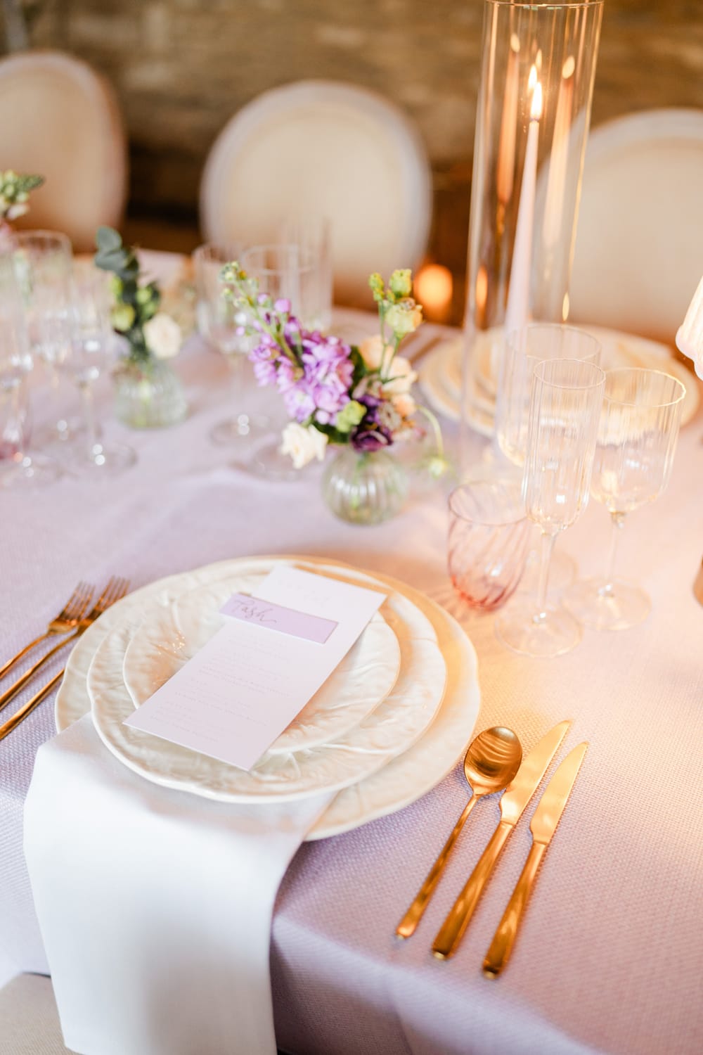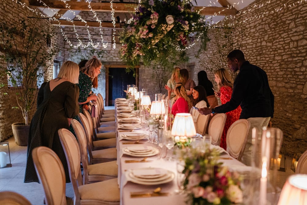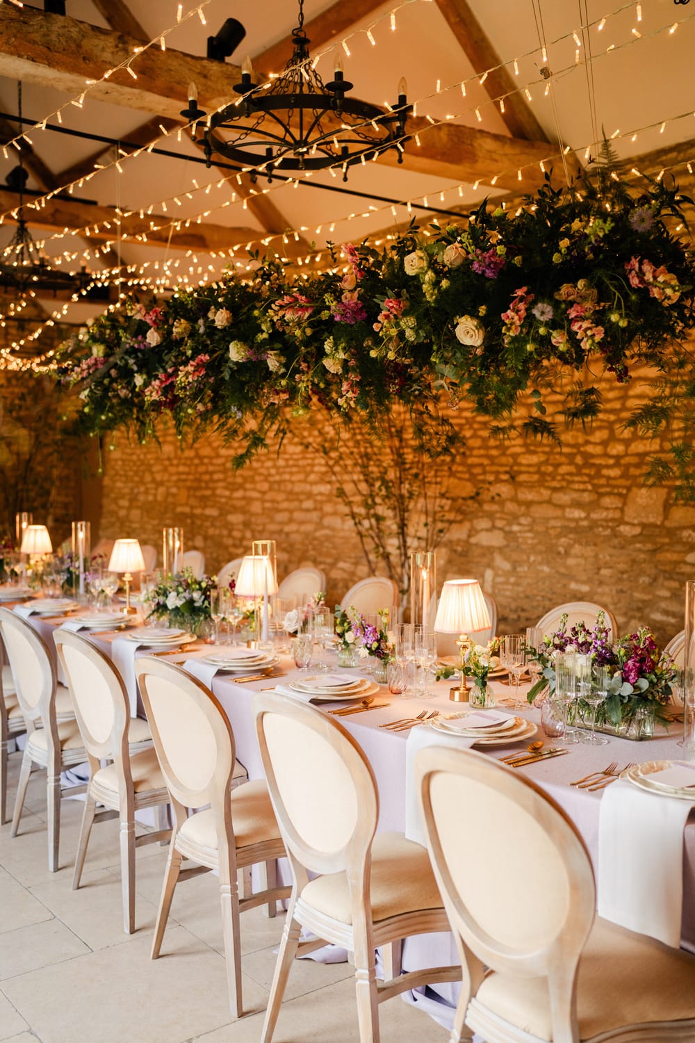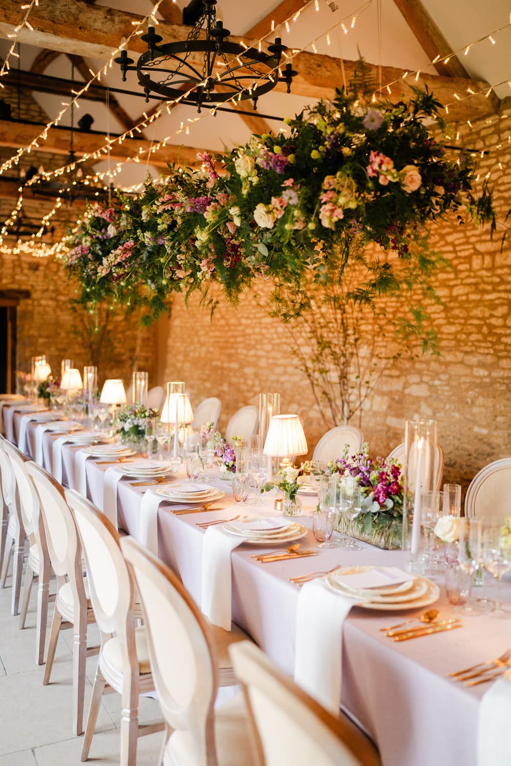 When the early evening came around, bringing with it balmy temps and bright blue skies (well, the whole day was glorious, to be perfectly honest!), we gathered back in the sun-warmed courtyard for some fizz, canapés and a fun and hands-on cocktail masterclass! Led by Cotswolds Distillery, we were taught how to make a fresh and vibrant spring cocktail with notes of elderflower, mint and cucumber. Once the shaking and making was complete, we enjoyed our sundowners al fresco before moving into Wenmans Barn for dinner. This is the barn that you might recognise if Caswell House is already on your radar (if it’s not….why not? I sincerely hope it will be now!). Think exposed stone walls, flagstone floor and masses of fairy lights strung between the beams. Although this space can accommodate up to 140 for a wedding breakfast, our table of 30 didn’t feel lost. In fact, it was perfect. The atmospheric candlelight, paired with the floral cloud installation hanging above us, adorned in hues of lilac and oodles of greenery, created an intimate yet refined vibe.