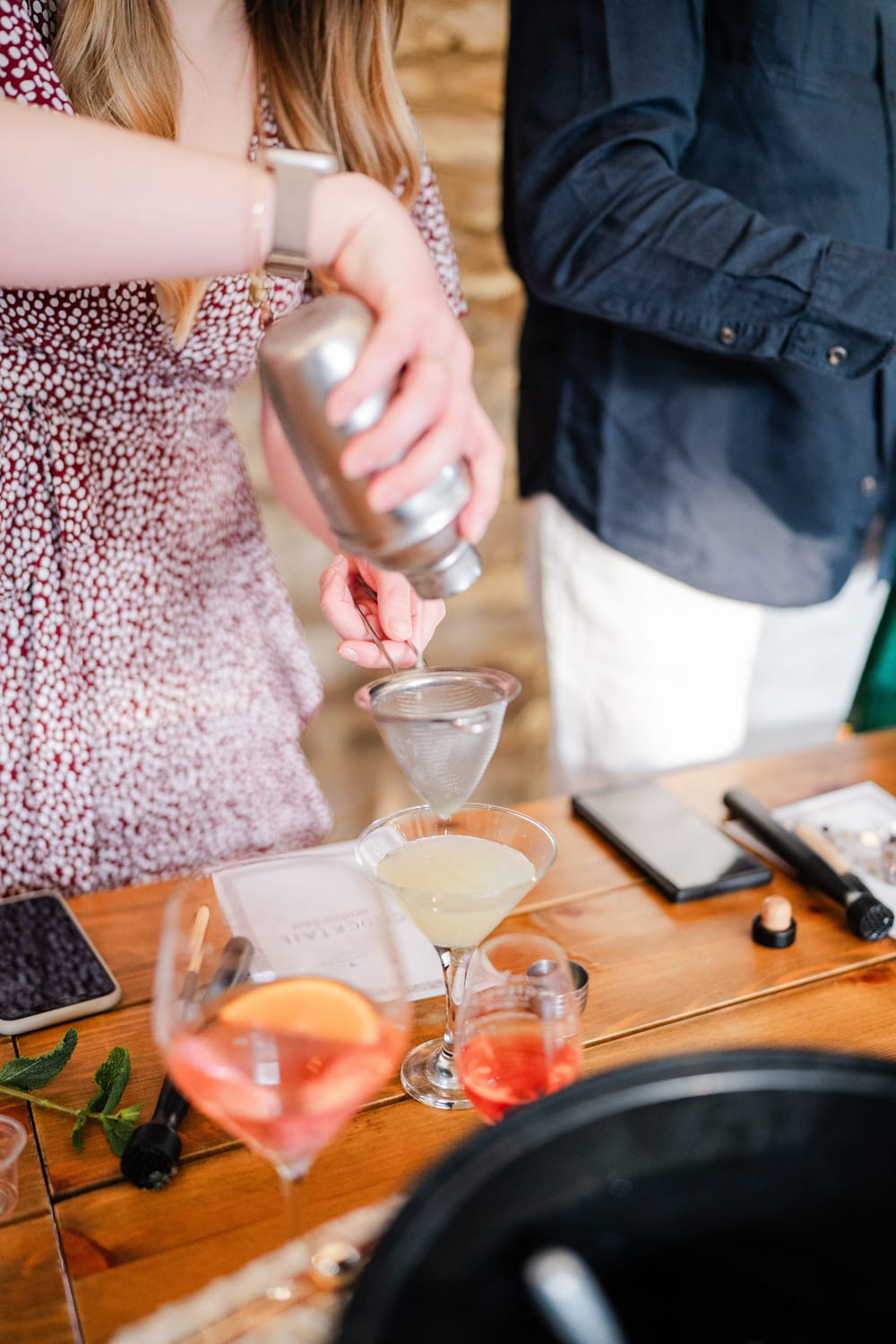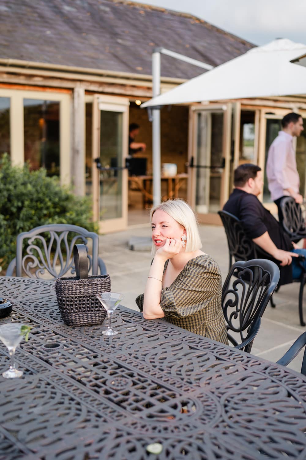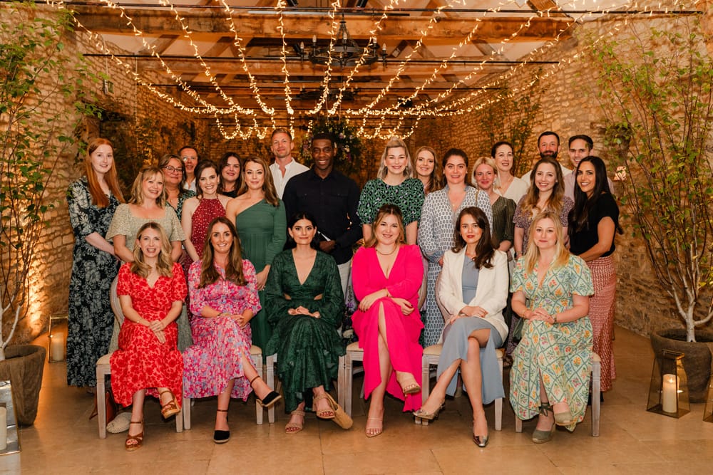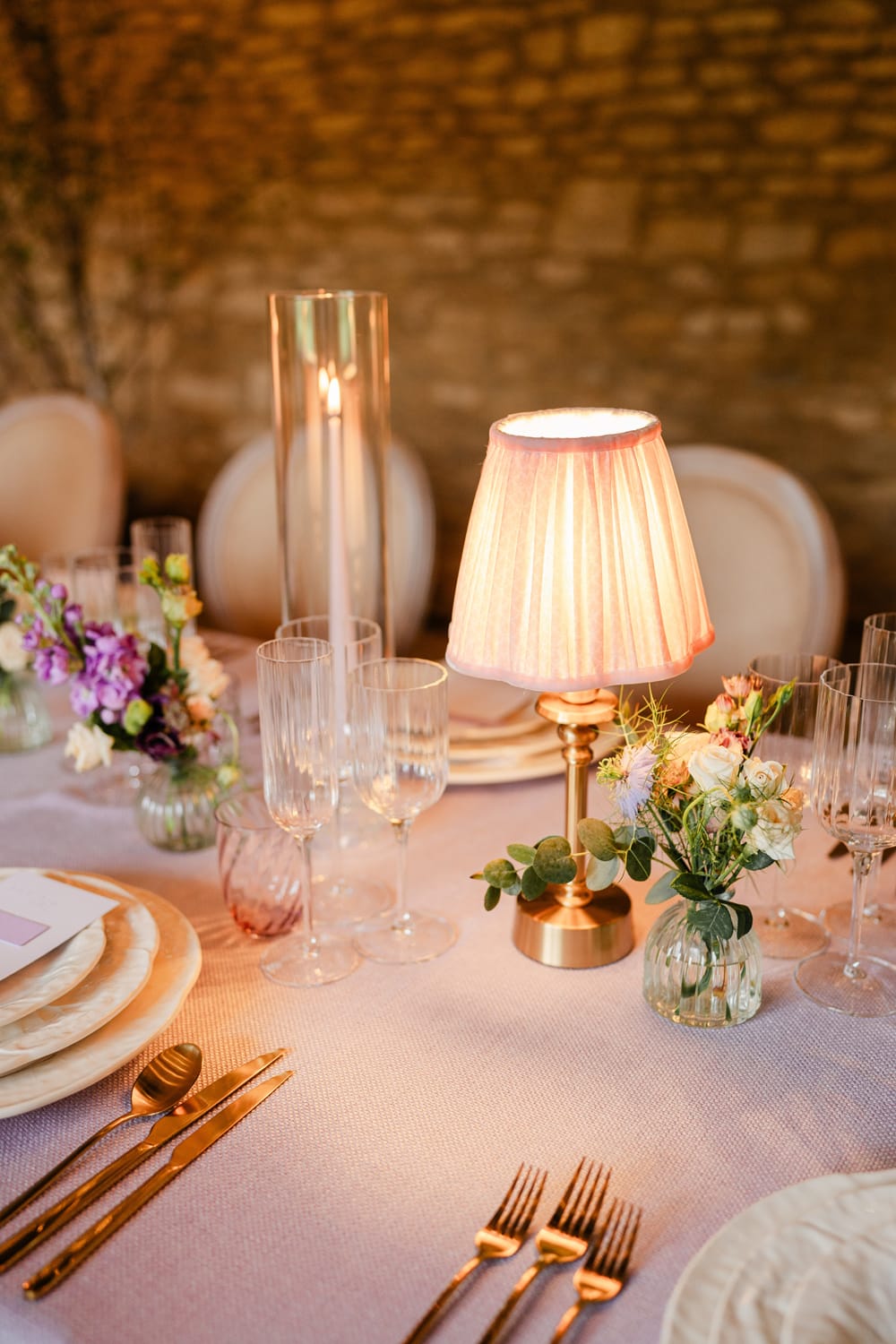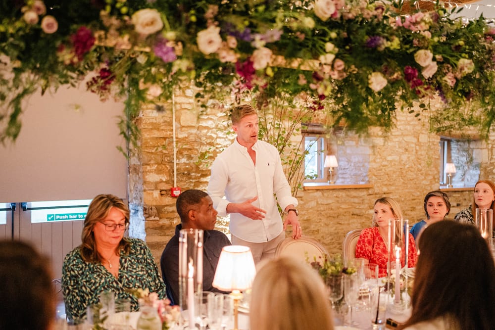 When the early evening came around, bringing with it balmy temps and bright blue skies (well, the whole day was glorious, to be perfectly honest!), we gathered back in the sun-warmed courtyard for some fizz, canapés and a fun and hands-on cocktail masterclass! Led by Cotswolds Distillery, we were taught how to make a fresh and vibrant spring cocktail with notes of elderflower, mint and cucumber. Once the shaking and making was complete, we enjoyed our sundowners al fresco before moving into Wenmans Barn for dinner. This is the barn that you might recognise if Caswell House is already on your radar (if it’s not….why not? I sincerely hope it will be now!). Think exposed stone walls, flagstone floor and masses of fairy lights strung between the beams. Although this space can accommodate up to 140 for a wedding breakfast, our table of 30 didn’t feel lost. In fact, it was perfect. The atmospheric candlelight, paired with the floral cloud installation hanging above us, adorned in hues of lilac and oodles of greenery, created an intimate yet refined vibe.