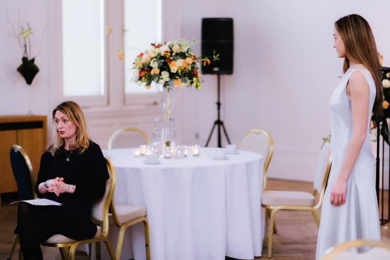 Once the gang had arrived we took to the grand staircase once more and made our way to the Ascham Room which seats up to 100. This room was quite different and had a contemporary feel with it’s white walls, wooden floors and high vaulted ceilings. Once again the light was incredible and I soon started to imagine dressing this blank canvas space.