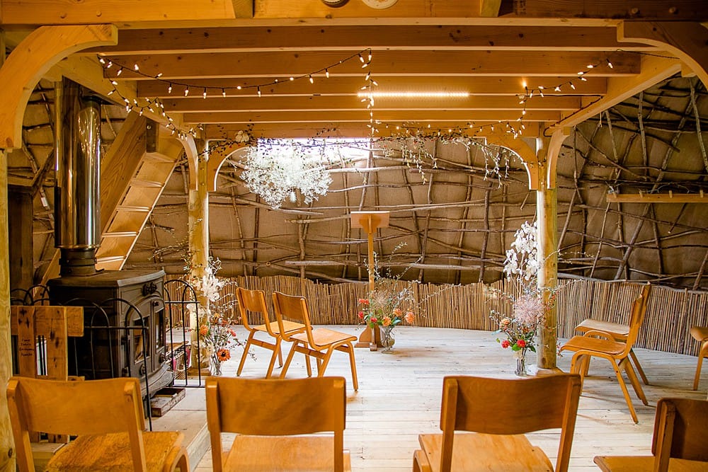 Marriages and Civil Ceremonies usually happen festival style in the field ceremony room, however small micro-weddings are now being offered in the amazing hazel structure at camp called The Wren’s Nest – it’s usually the Bridal / Honeymoon Suite but during the day can become a natural and cozy cathedral of branches and flowers – then when the party of 15 are dining in the dressed warehouse, sipping hand-crafted cocktails or sitting around the fire pit the space can still allow the couple to stay over. The new Little Hut is also the perfect add-on for witnesses and close guests.